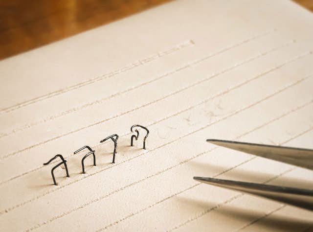 太宰治、夏目漱石、谷崎潤一郎といった文豪たちの原稿に綴られた直筆文字を、針金で再現するアーティスト・荒井美波の個展。