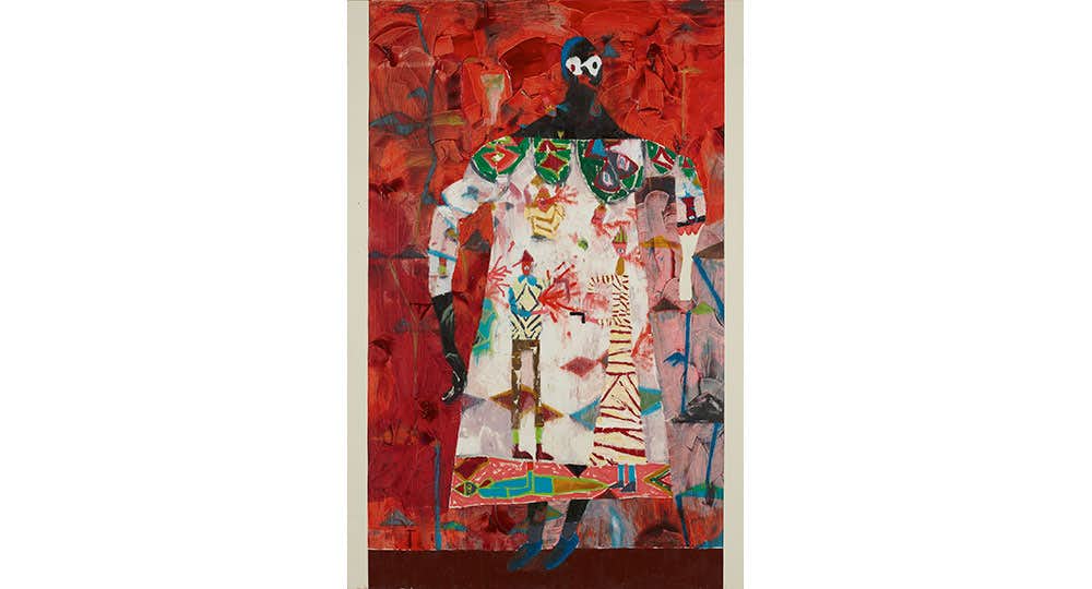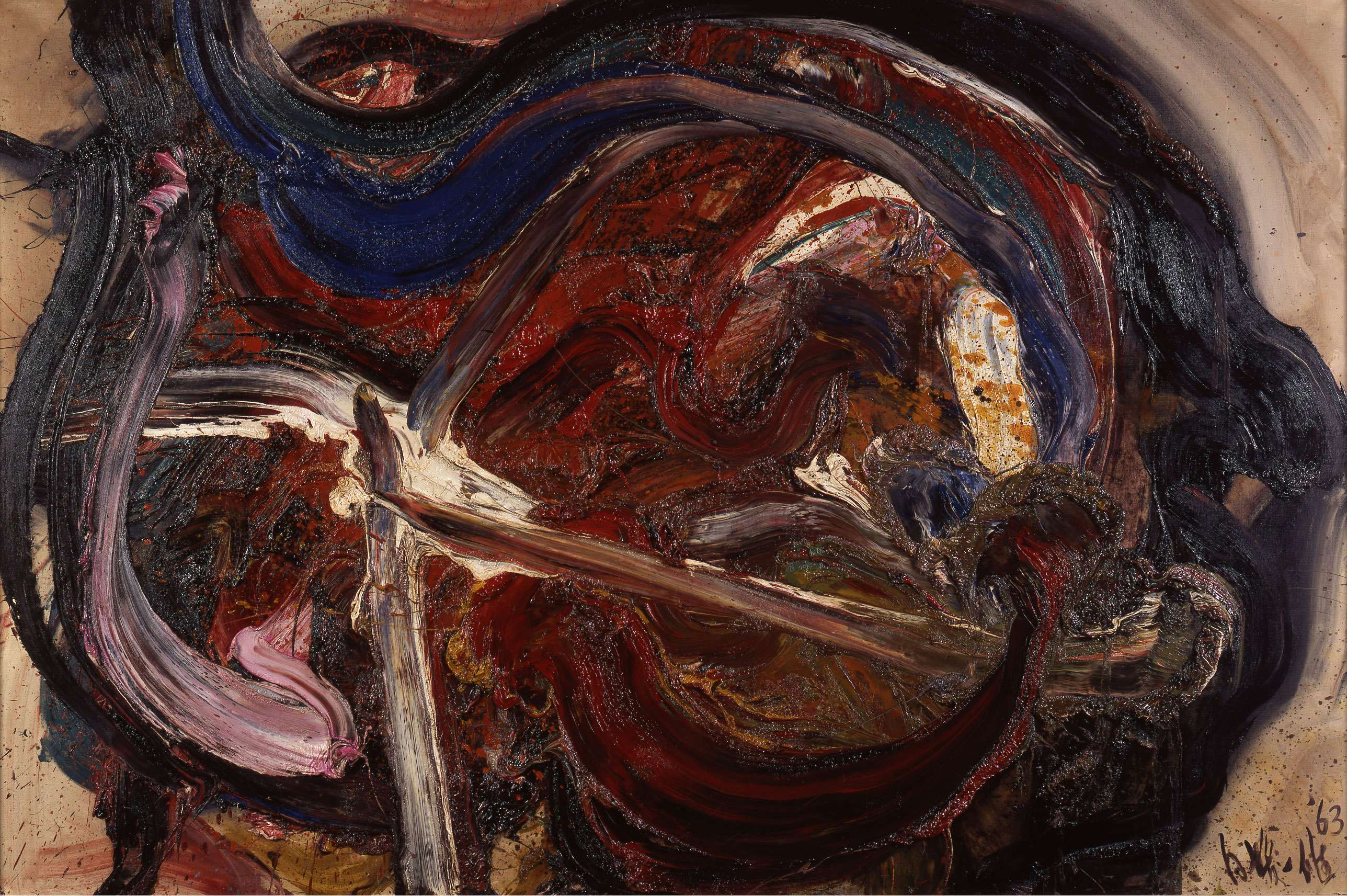 導入となる第一室では、「制作行為における身体と動き」に着目。兵庫県尼崎市所蔵の白髪コレクションを全国の美術館で紹介する「白髪一雄発信プロジェクト」と共同し、足で描くアクション・ペインティングという独創的な制作スタイルで国際的な注目と高い評価を集めた美術家、白髪一雄(1924〜2008)の初期から晩年に至る作品の魅力に迫る。