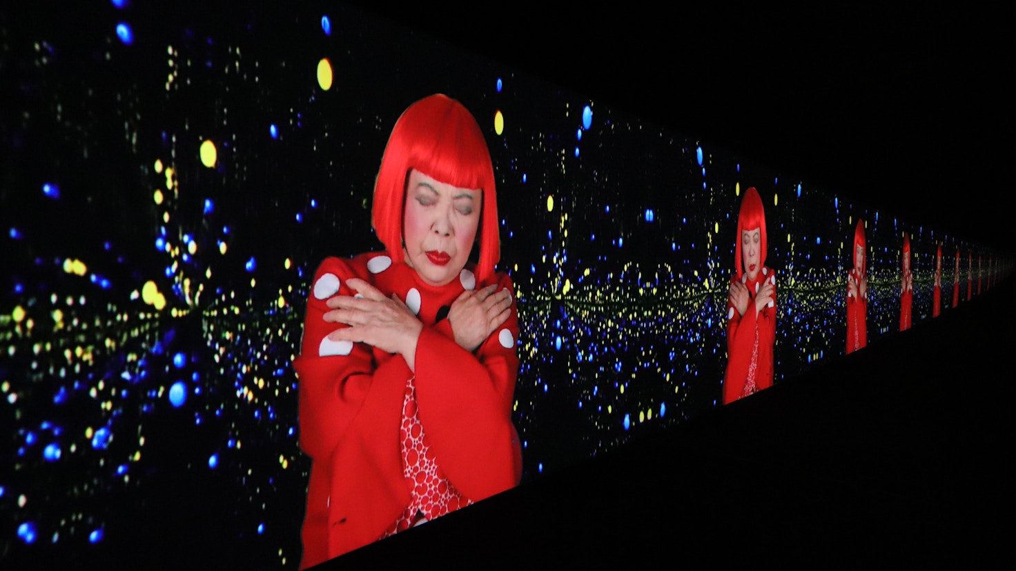 恐怖をもたらす幻覚を、無限の宇宙の星屑の中に没入するような恍惚をもたらすビジョンへ。宇宙や未知の世界への憧れを表現する草間の現在形を見せる。