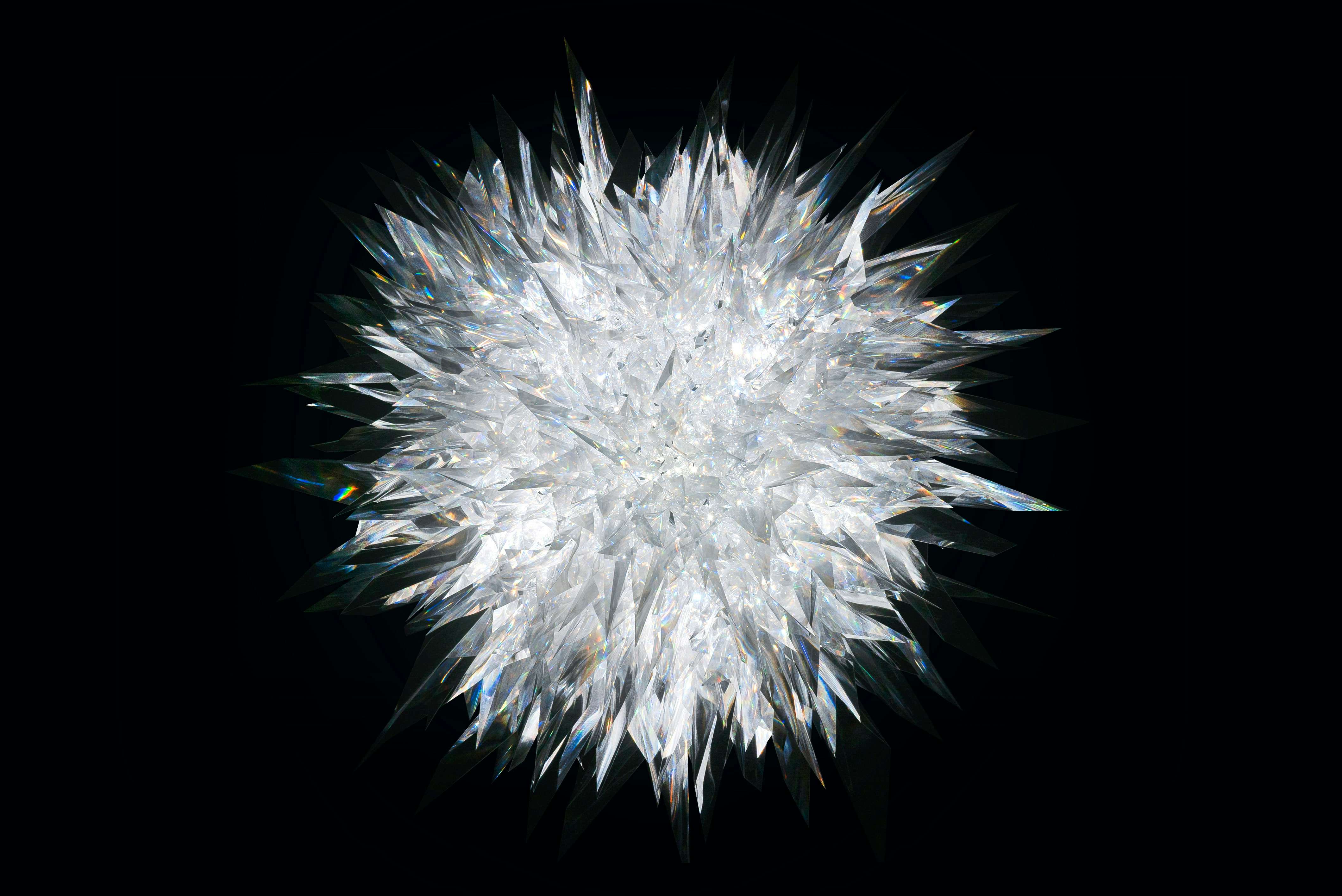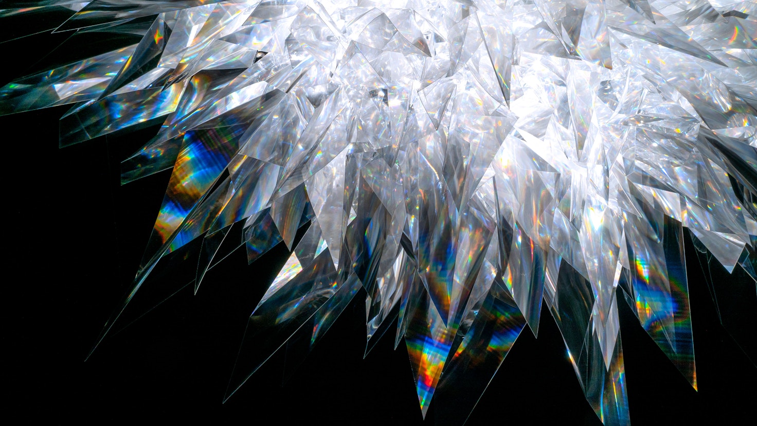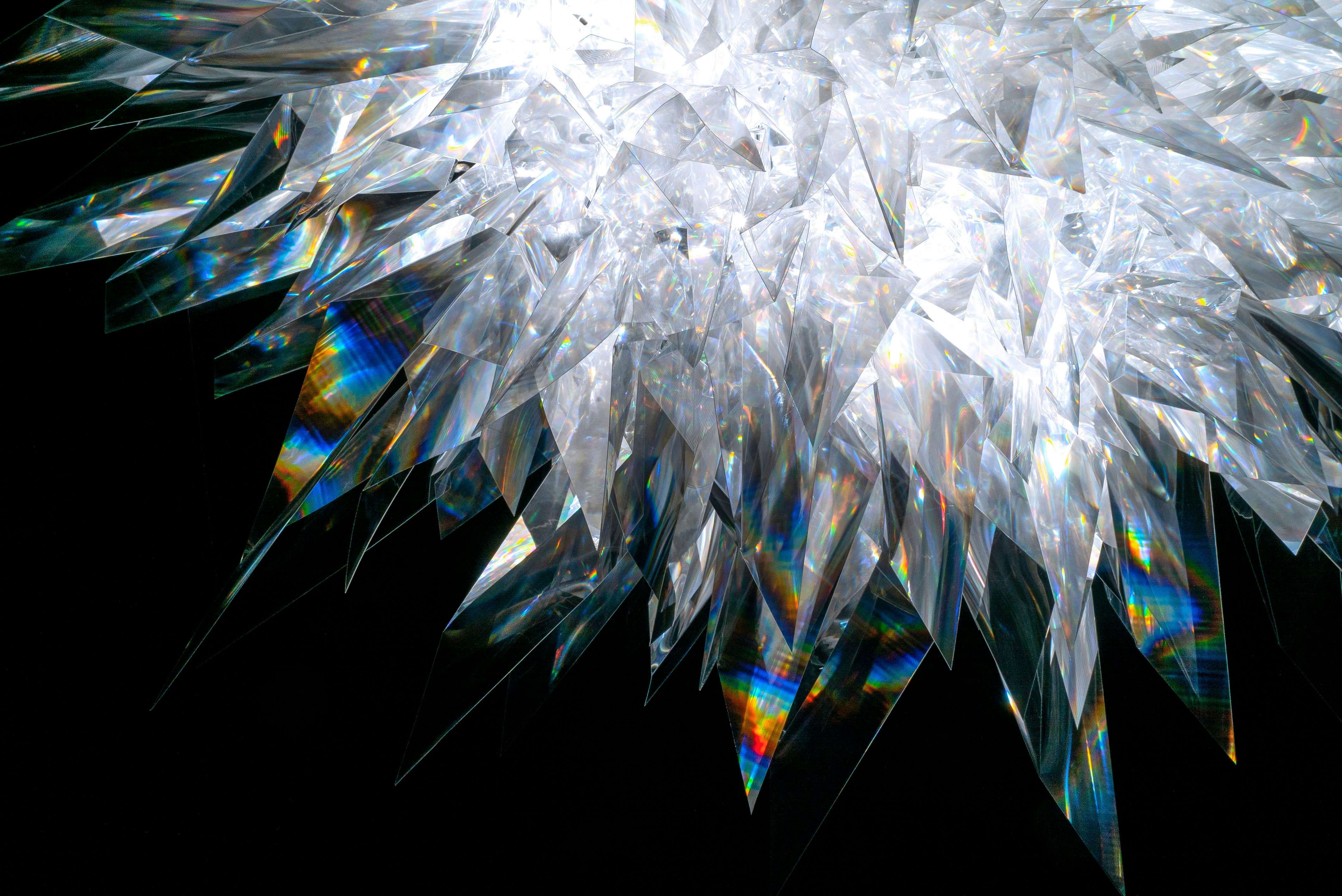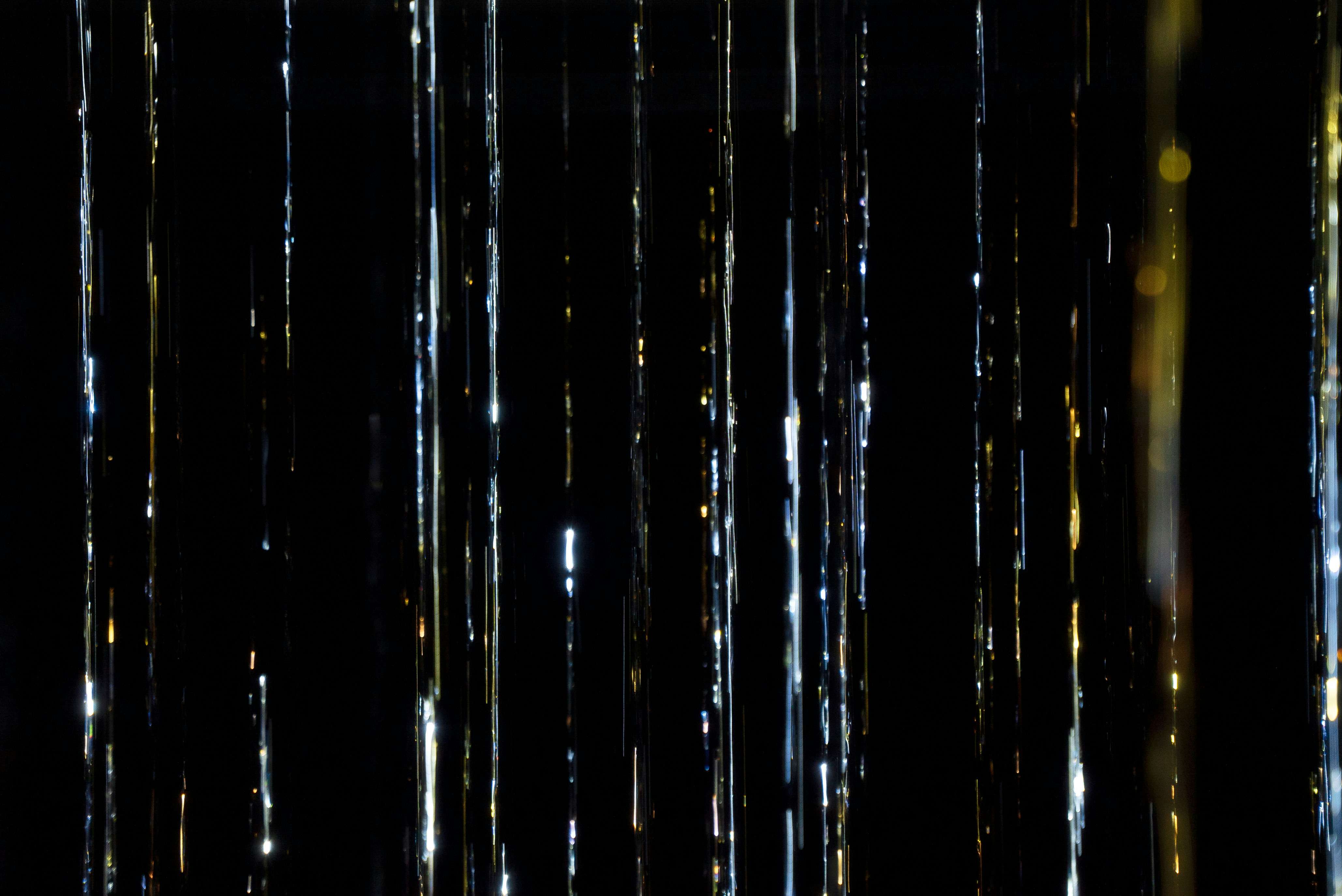 新作の《SPECTRA》は世界初の技術を使った光と水のインスタレーション。太陽光の放射角を持つ特殊な光が水を透過して反射することにより、閃光のような眩い光を放つ。暗い空間に現れる光の群はきらびやかに輝きながらも、儚く静かに、しかし鑑賞者が内に秘めた自らの強さを目覚めさせてくれるようなエネルギーを持つ作品となっている。