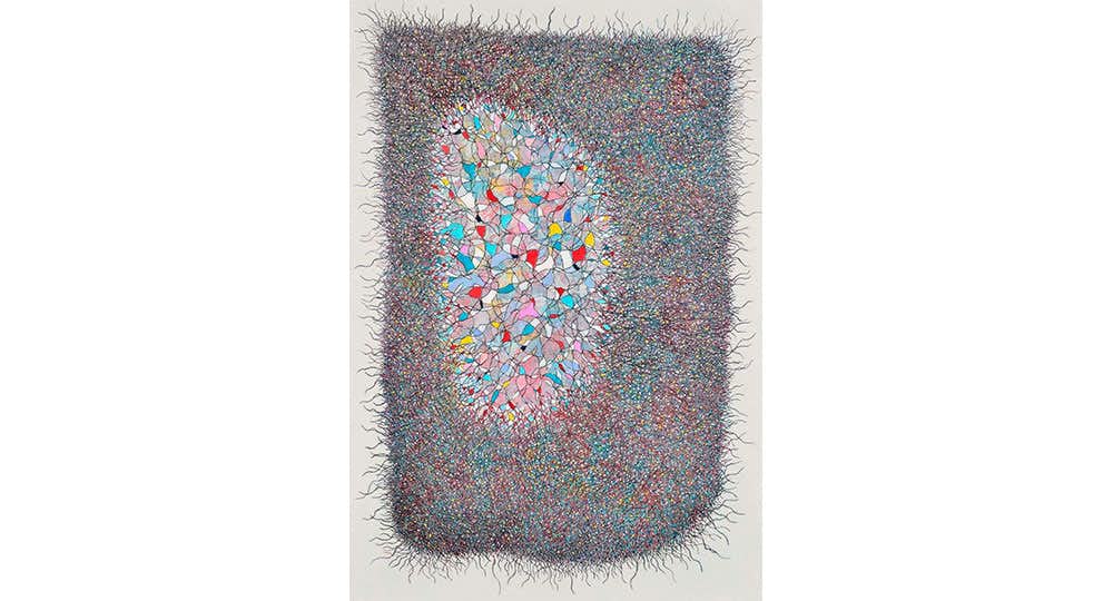 蜘蛛の巣のように広がる線は、さらに無数の網目をかたちづくる。この網目を一つひとつ彩色することで、隣り合う色の色相の差が見る人に奥行きを感じさせ、平面でありながら特定の色が浮き上がって見える仕掛けがなされている。