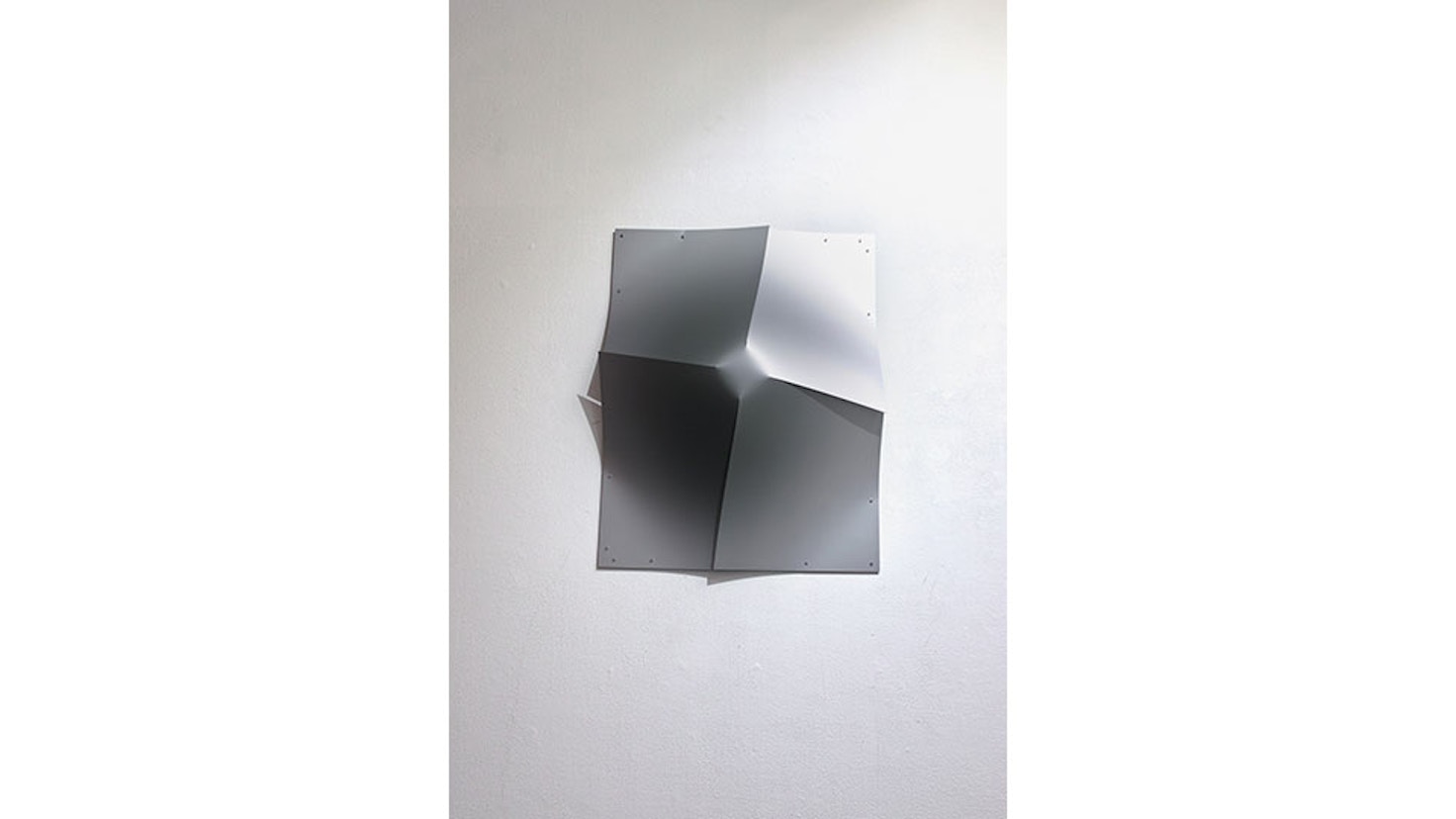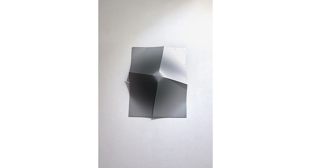本展では「transition」をテーマに、四方が繰り返し制作に用いてきた、素材の金属板そのものの存在を浮き彫りにするような作品群を発表。一片の金属板が、作家による必要最小限の切り込みや折り目によって何通りにも姿を変え、そして周囲を映し込む作品群は、めまぐるしく移り変わる世界情勢の変容そのものを思わせる。