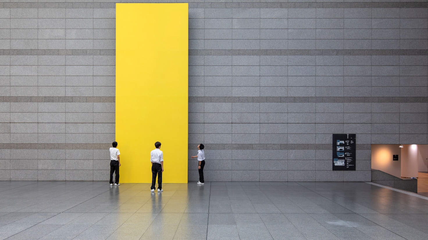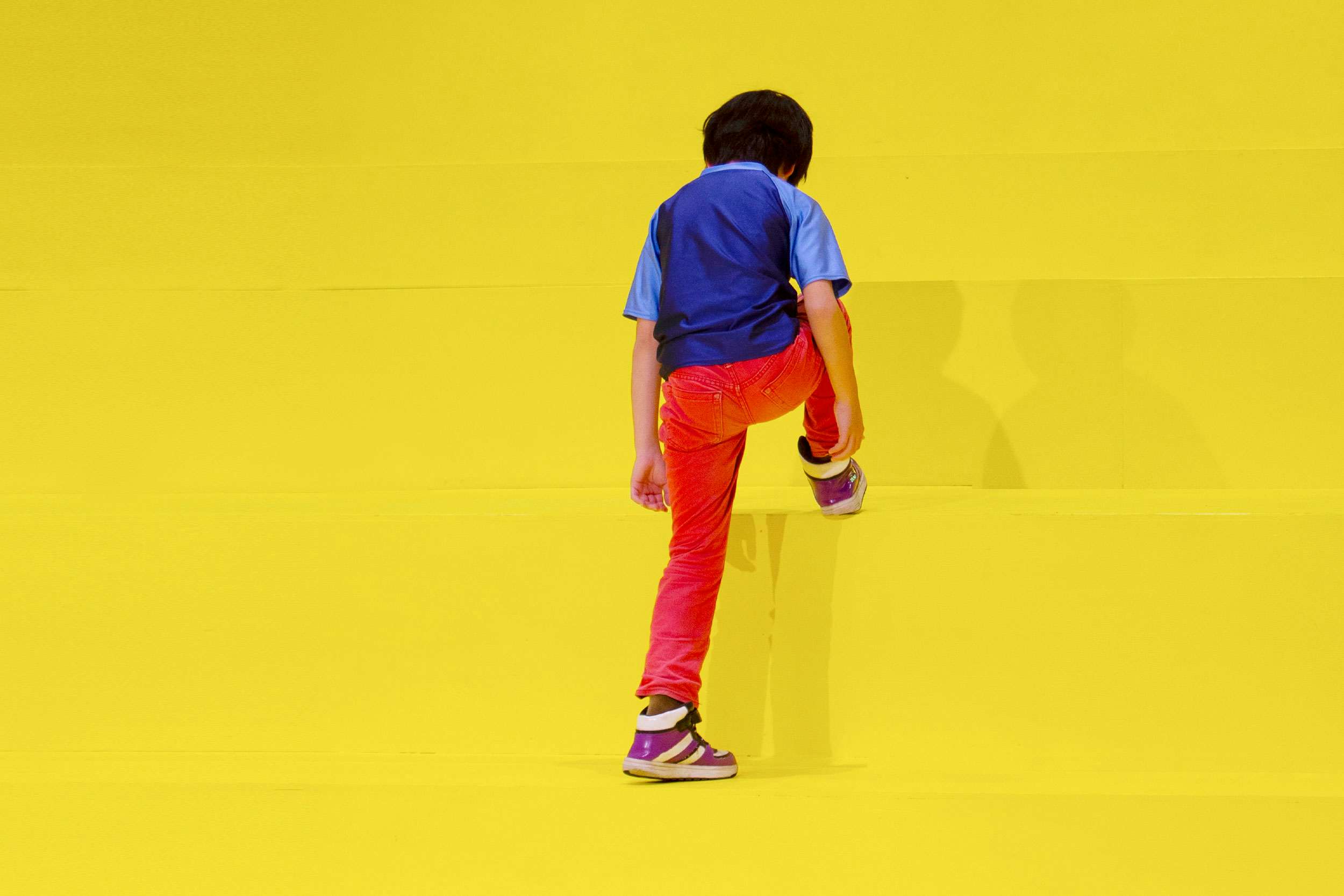 写真に収めたくても全貌をとらえられない《ピンクの猫の小林さん》(2016〜)や、一見無関係と思われるもの同士をロープでつなげ、思いがけない構造を視覚化する《遠近の設計図》(2019〜)、そのほか、鑑賞者が目の前の壁を押し進めることで、別の空間に新たな事象が起こる《0人もしくは1人以上の観客に向けて》(2019〜)など飯川の作品は、私たちの周りにある情報が全体の一部でしかないこと、そして人の認識が不確かであることを思い出させる。