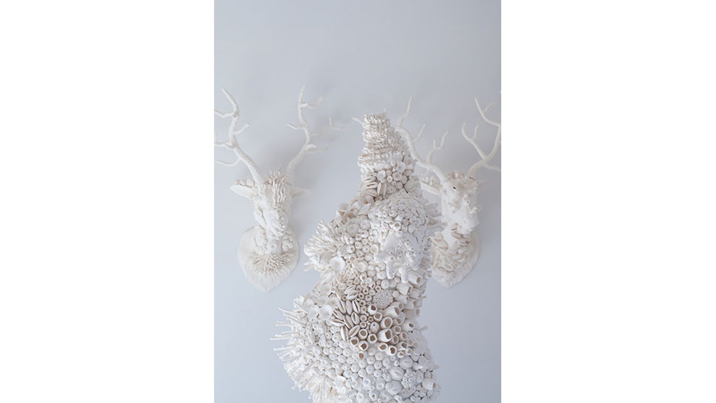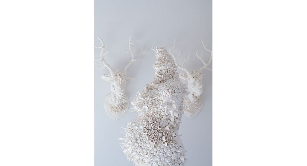 本展は、白化した珊瑚を一面に纏ったかのような男性像や妊婦、鹿の頭部などで構成される新作《Dysbiotica》を展示。同作は今年1〜3月にかけて、滋賀県立陶芸の森でのアーティスト・イン・レジデンスにて制作された。
