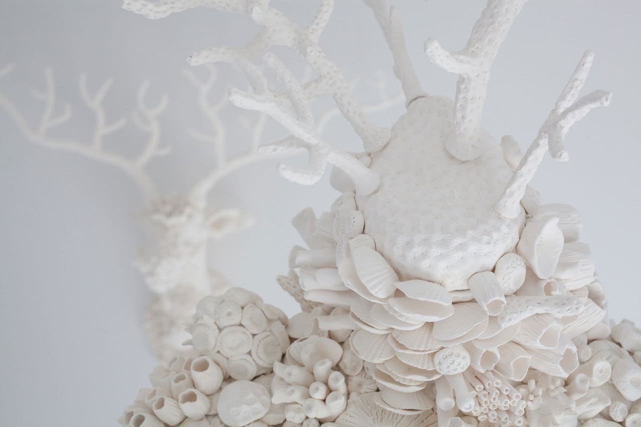 絶妙なバランスで構築された微生物群によるミクロ世界の崩壊がマクロ世界へと連鎖していくこと、そして、人と動物と微生物の織り成す共生の世界の崩壊。そんなテーマを持つ《Dysbiotica》は、世界的な規模で拡大する珊瑚の白化現象(珊瑚の死滅)を題材とし、磁器土を使用した白く硬質な表面に、終焉の気配や空虚な印象を持つ。そのいっぽうで、妊婦や鹿など生命力あふれる存在が、未来への微かな希望を感じさせる。