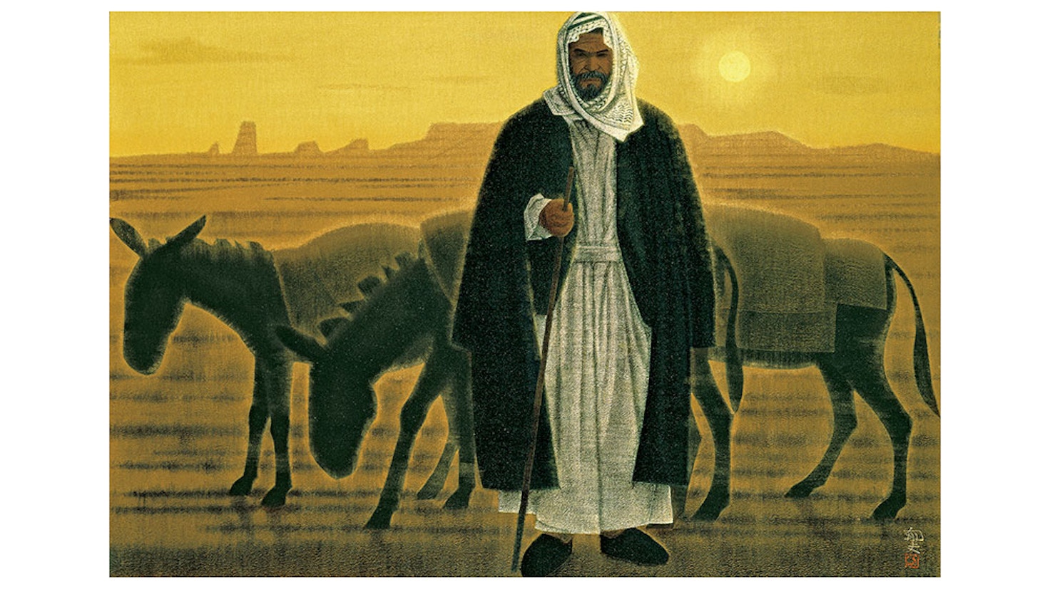平山がシルクロードを旅するきっかけとなったのは、東京藝術大学の中世オリエント遺跡学術調査団の一員として、トルコのカッパドキア地方に派遣されたときのこと。厳しい天候や渇き、飢えにひたすら耐え、シルクロードを往来した古の旅人たちに思いを馳せながら、東西文化交流の道であるシルクロードを行き交うキャラバン隊に平和を見出し、平和の祈りを込めてその姿を描いた。