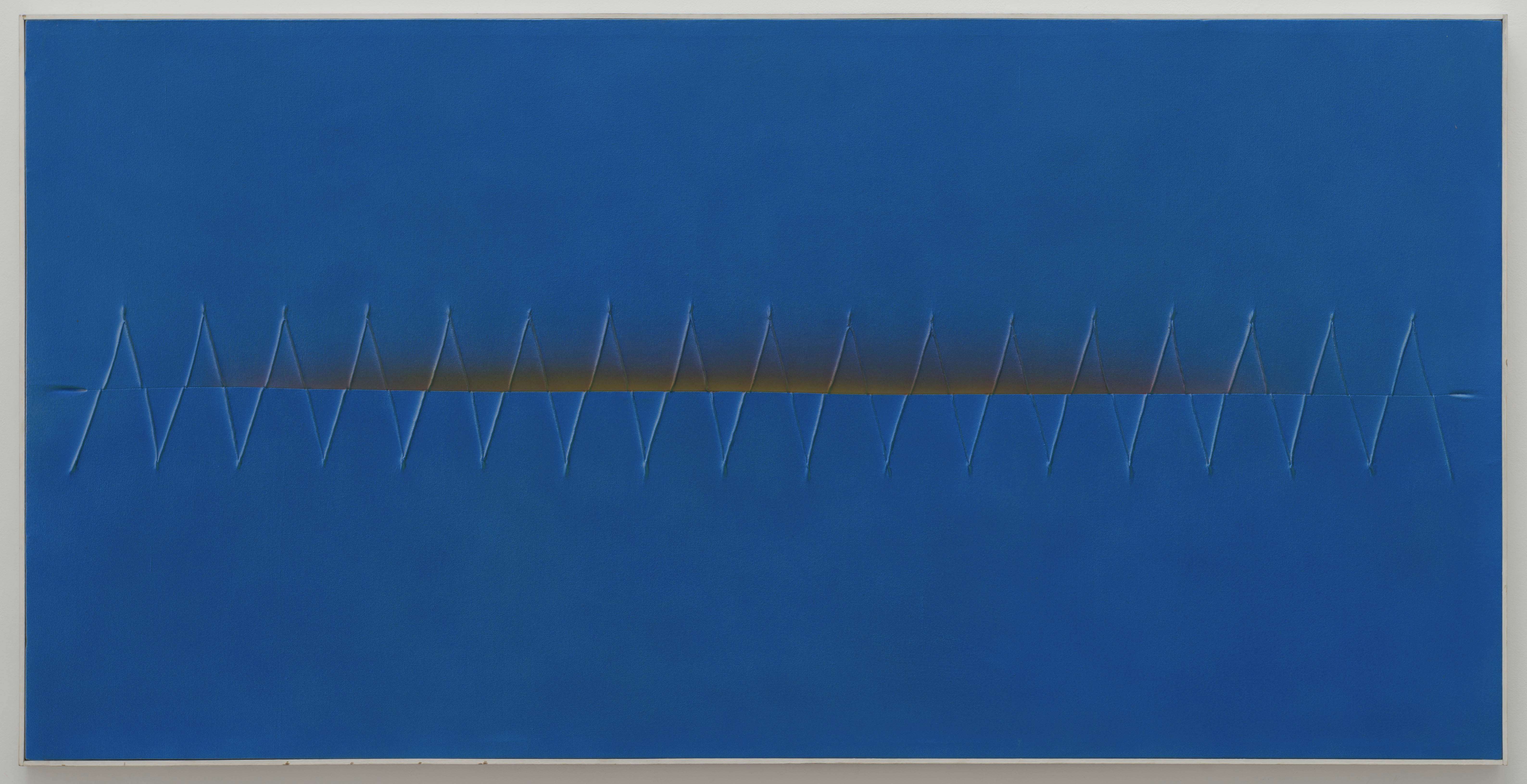 前川は1959年、第8回具体美術展に初参加し、62年より同協会の会員となった。60年代は織り目の粗いドンゴロス(麻布)を力強く隆起させ支持体とした絵画作品を制作。布や紐、ロープを張り合わせるなど自由な発想で創作を続けたことで注目を集め、具体美術協会解散後の70年代には、多様な縫いの技法によって新たな絵画空間を探求し、国内で多数の賞を受賞した。