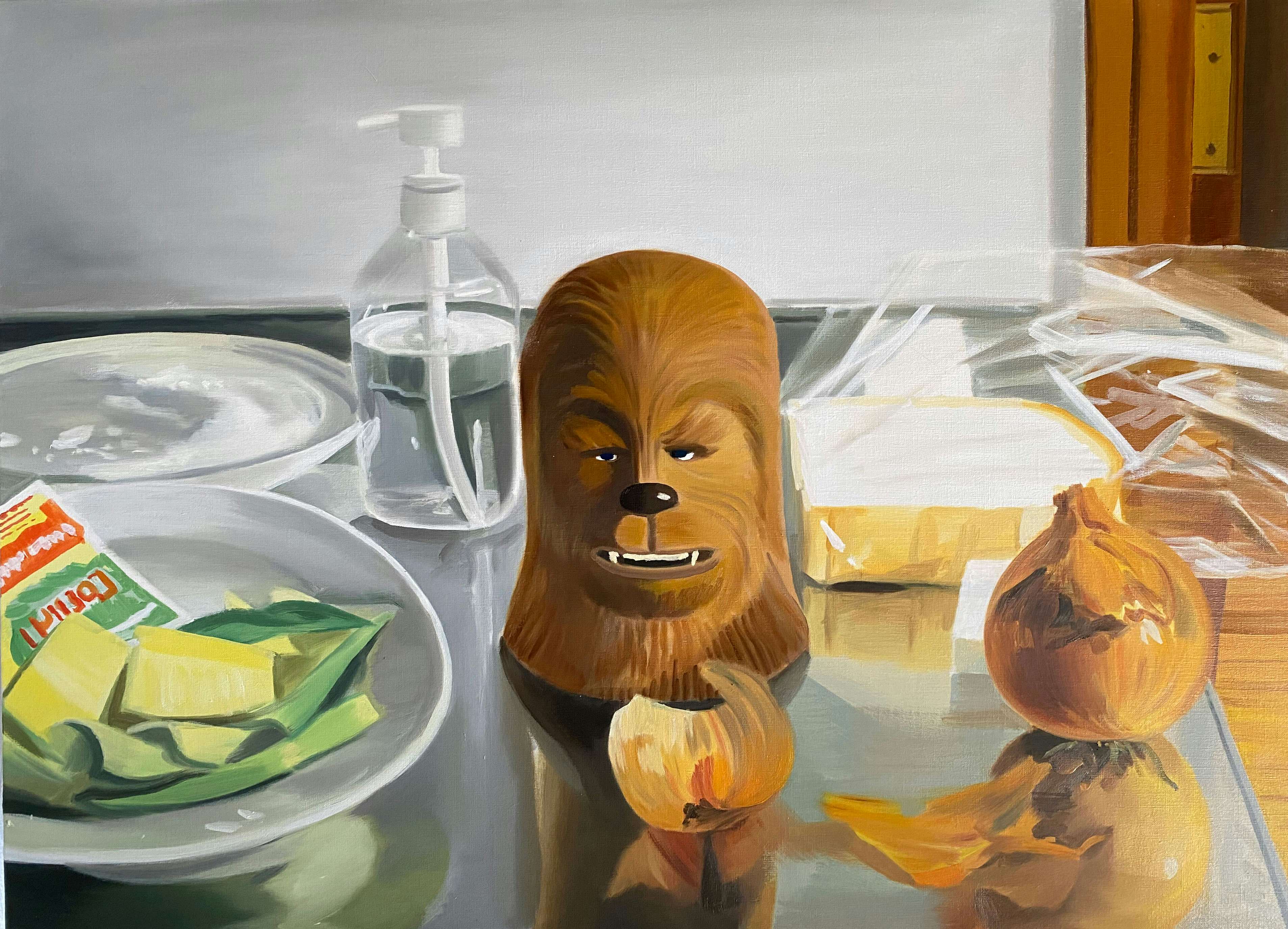 こんがり焼けたトースト、皿の上の色とりどりの果物、折り重なったコアラやくまのぬいぐるみ。親しみあるモチーフに、親密であたたかな様相を湛える油彩画を描く今井麗は、最新作約20点を発表する。