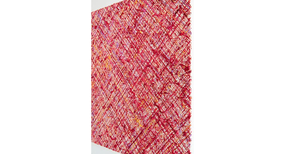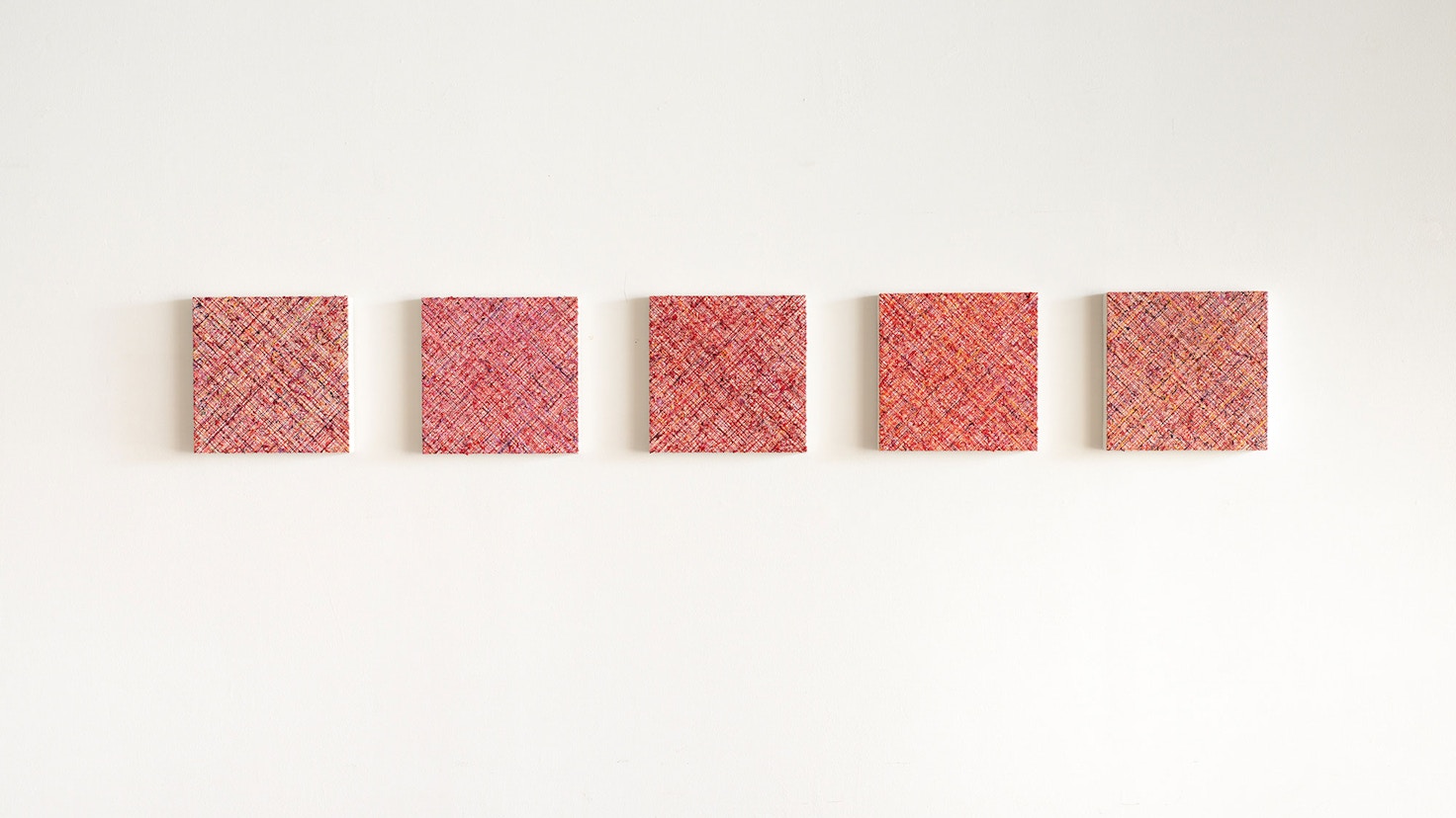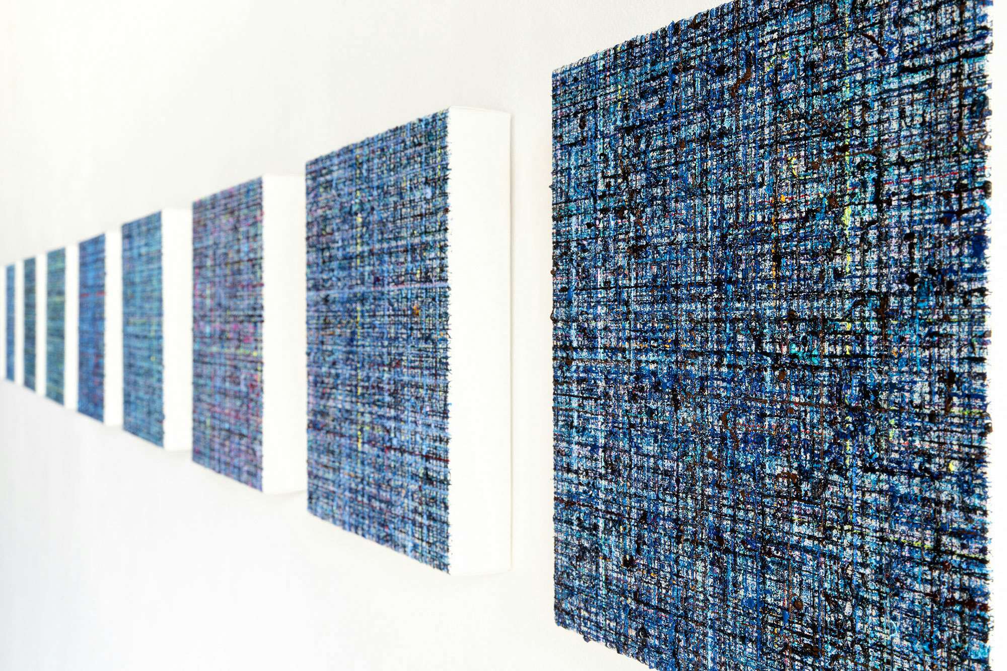 本展では、油彩をほどこした糸をキャンバス上に無数に弾き、平面を立体に仕上げていく、横溝の代名詞と言える技法で制作された新シリーズ「angle」を発表。「between the lines(行間を読む)」の意味を冠し、作家の意図や、シリーズの作品一つひとつのあいだに醸し出される空気・間合いを感じ(読み)取るような展示となる。