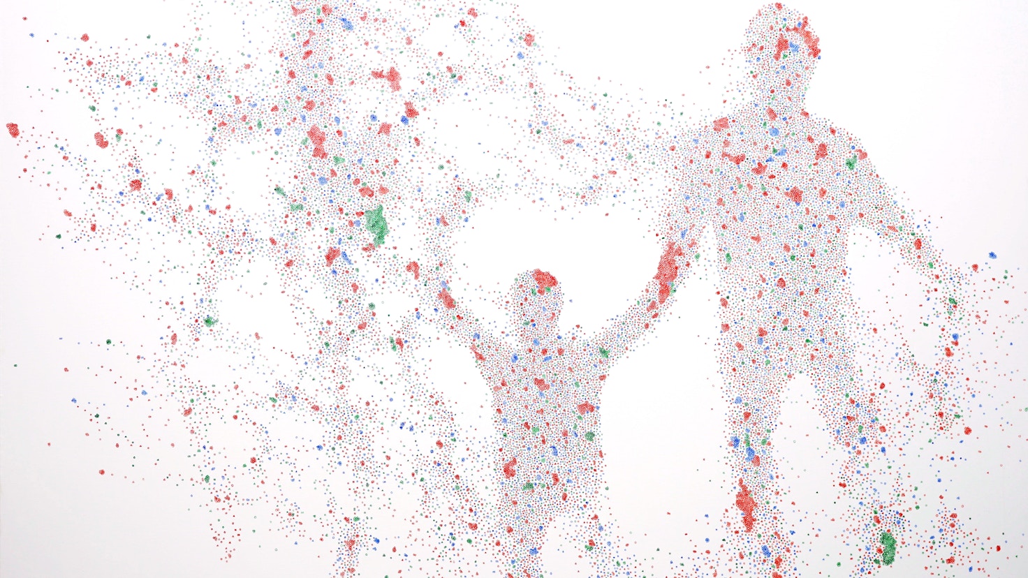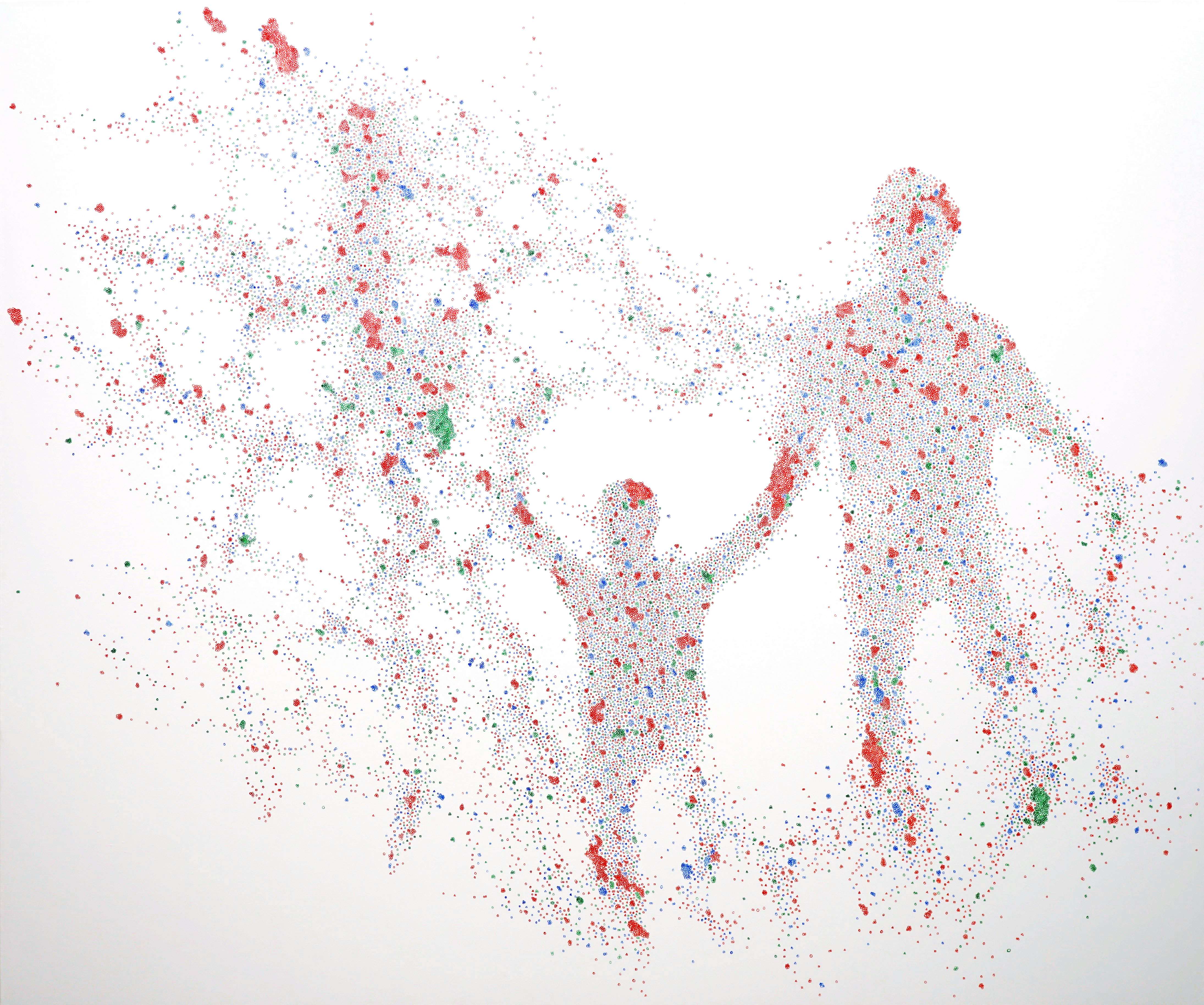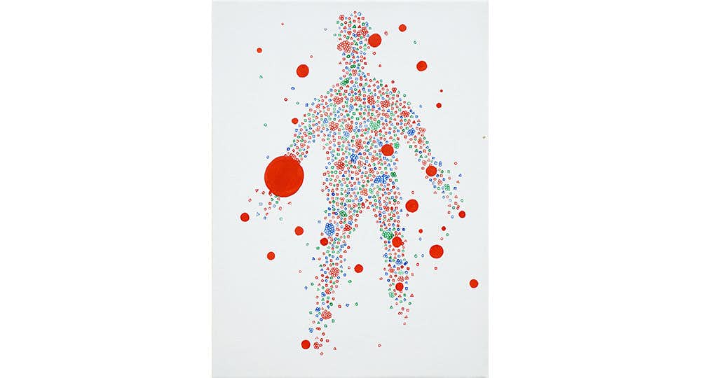 これまで青木は光の3原色である赤・青・緑の3色のみを使用したふたつのシリーズを中心に制作。ひとつは「丸(○)」「三角形(△)」「四角形(□)」の記号を1個ずつ描き入れて構成した油彩画と、もうひとつは3色の色鉛筆で人物を描く影のシリーズだ。青木はそれぞれに厳格な描画方法を定めることで自らが取り込んだ情報を選別し 「描きながら消していく」ことを行いながらも、プロセスを超えた先に立ち上がる気配を作品に留めている。