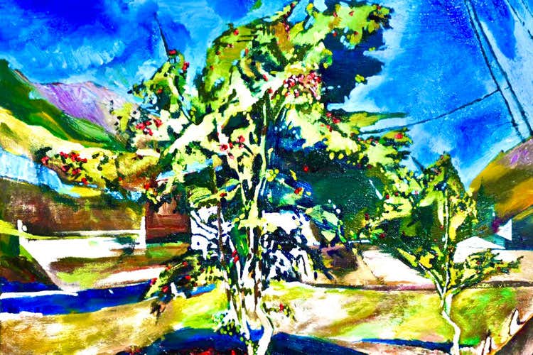 鮮やかな色彩表現、絵具をふんだんに使った大胆なストローク、どこか懐かしさを感じさせる日常のワンシーン。深澤は各地を転々としながら、その場所で印象に残った風景を独特な構図と色彩感覚で描く。
