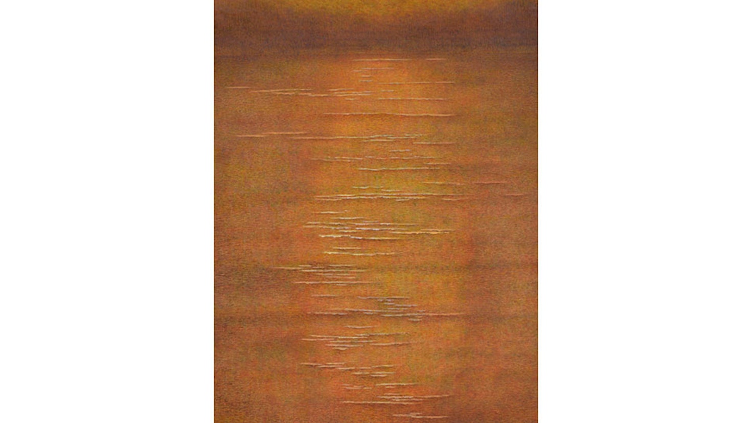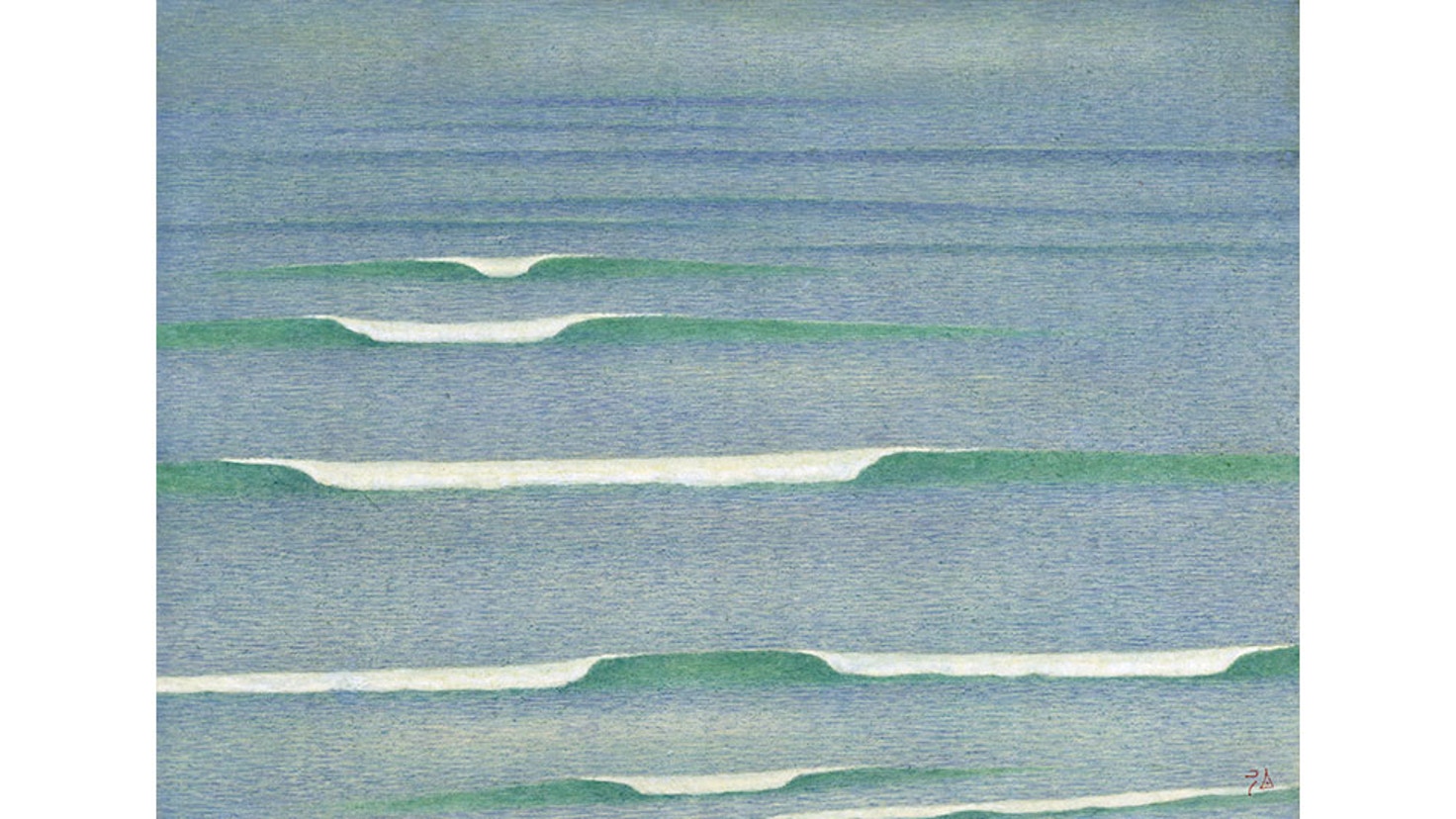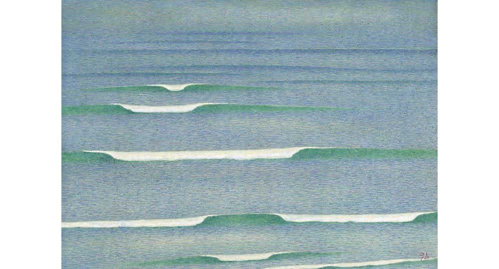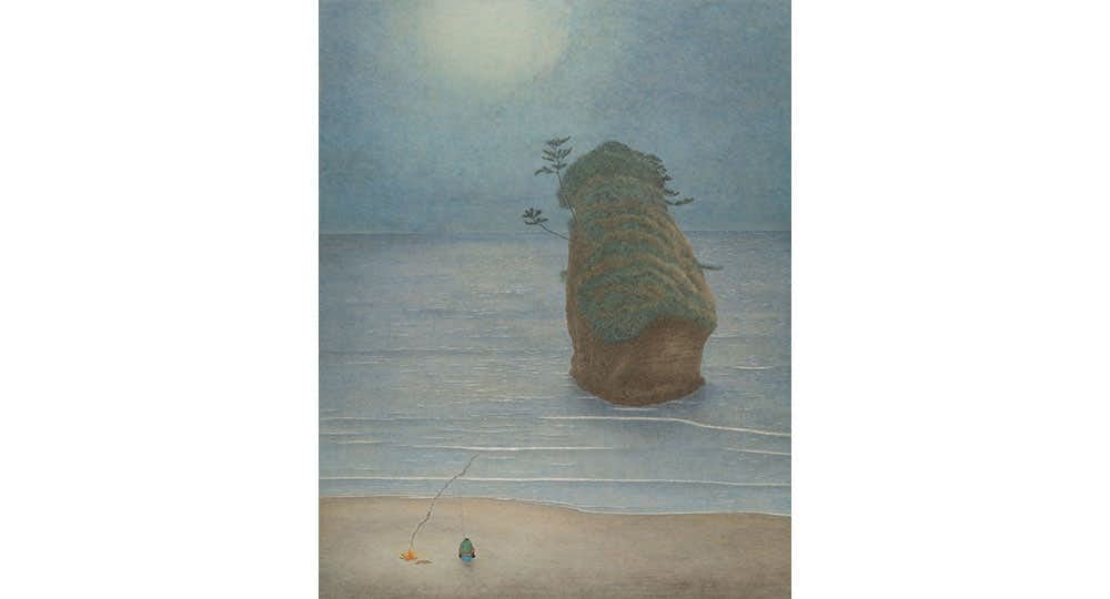 手すきの和紙に墨や岩絵具で描かれた海、空、山々。現代社会の利便や喧騒を離れ、孤独とも言える環境で己を研ぎ澄ましていった画家がたどり着いた「桃源郷」のような風景画は、穏やかで静寂で凛としていて、時にユーモラスでもある。