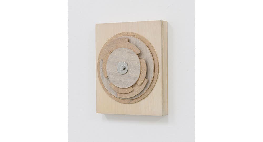 円状の木材がダイヤル式に可動するの特徴をもつ同シリーズには、固定化した「かたち」のない無数のパターンが存在。自転・公転の運動の仕組みを参照して仕掛けが施された装置は、暗号的な意味合いを帯びて鑑賞者の思考に迫る。