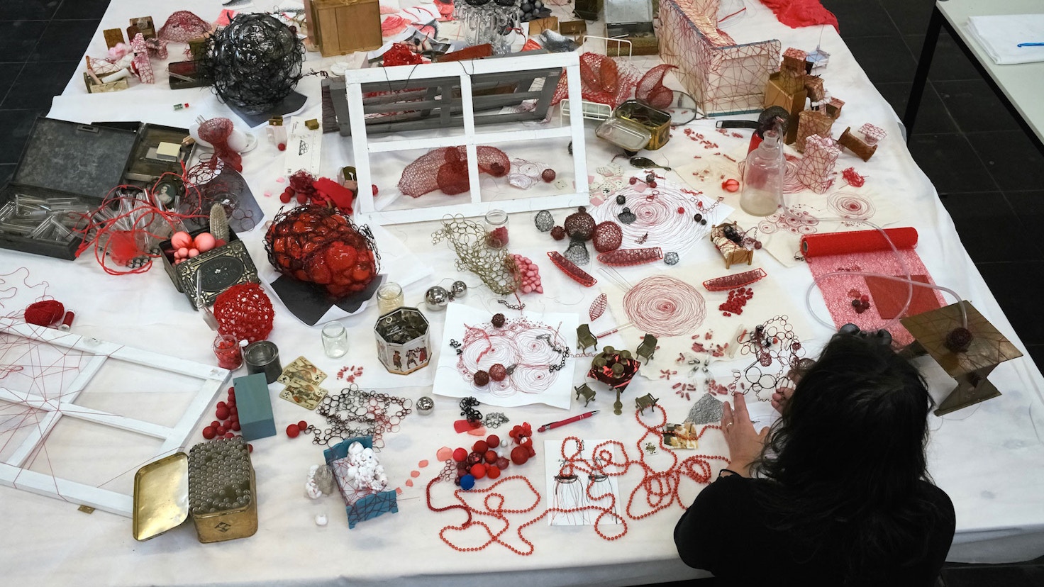 展示室の中央には、アトリエの作業台のようなテーブルを配置。作家のメモ書きを含む紙切れや立体的なドローイングとも言える様々なオブジェで埋め尽くし、空間全体をインスタレーションとして構成する。