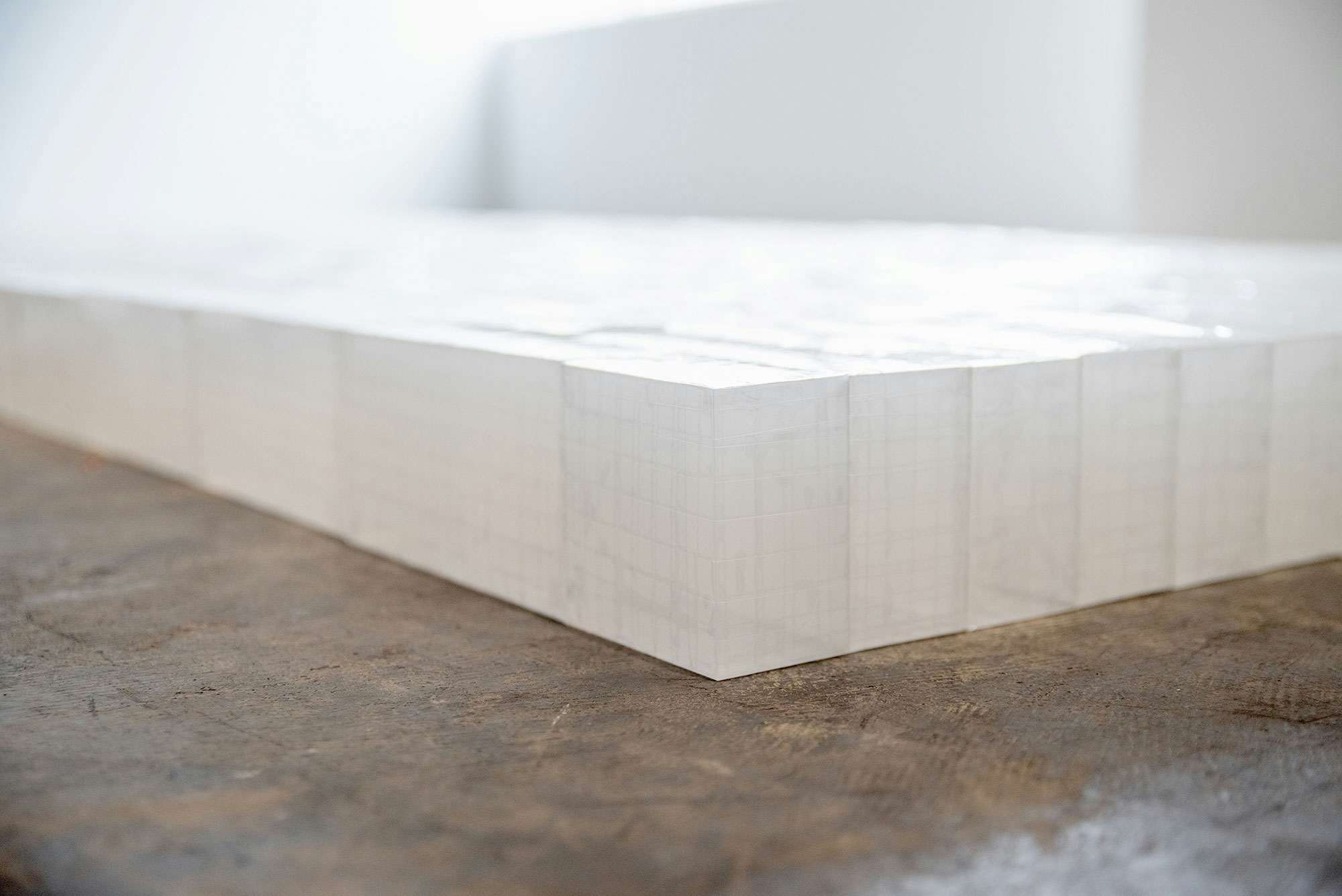 空気を可視化した彫刻は、「ある」ようで「ない」、「見える」ようで「見えない」と言う繊細な感覚を想起させる。光をまとい重力を認識できないブロックは、まるで建築物の亡霊のように光る彫刻として静かに、そしてかすかに存在している。会期後には、消えてなくなる儚き幻影は、静謐な時間と空間のなかで鑑賞者を柔らかく包み込む。