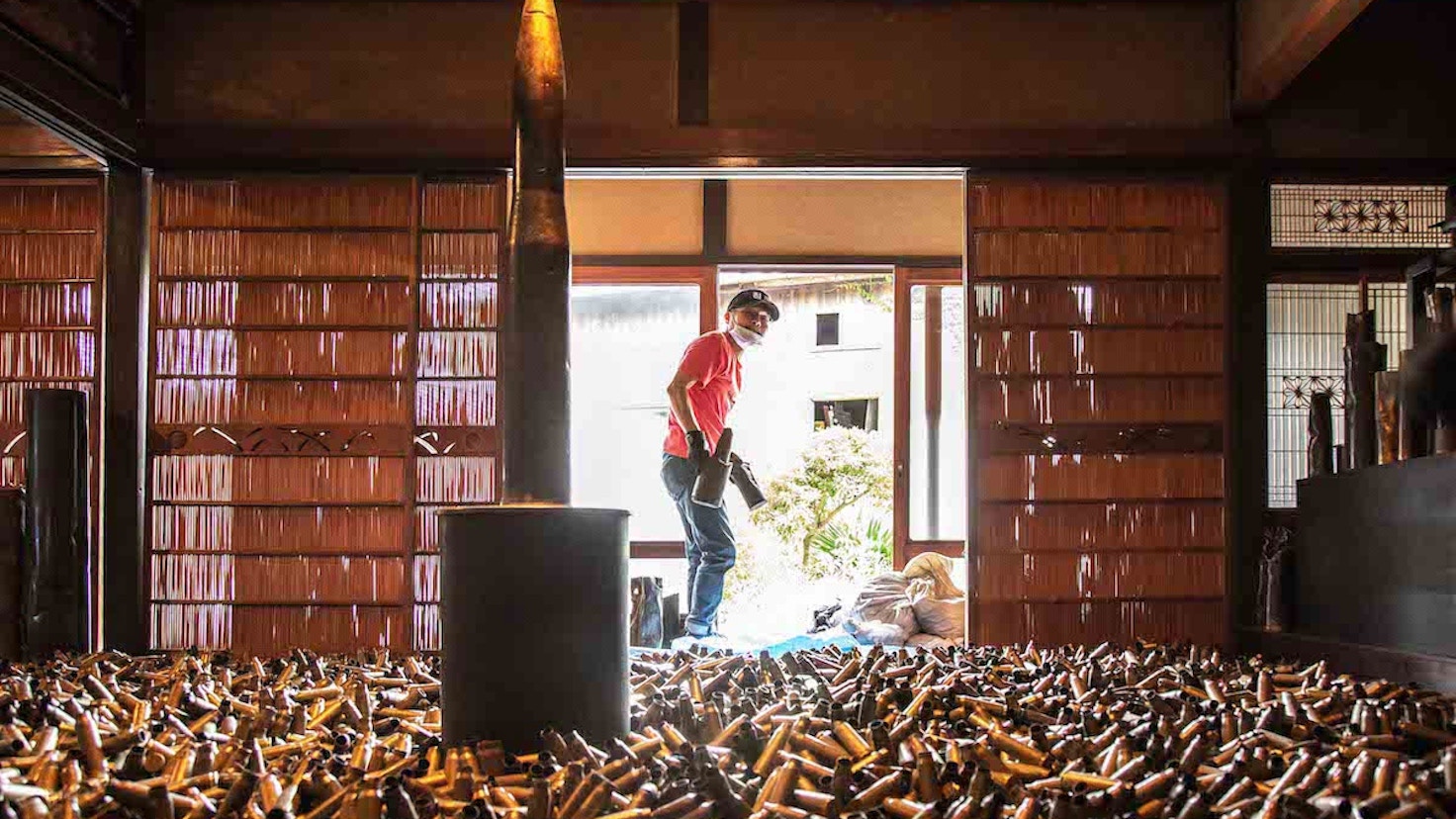 本展では、百島の古民家を改修した施設「乙1731-GOEMON HOUSE」の大広間を、実際に戦地で使用された約3トンの薬莢(やっきょう)が埋め尽くすインスタレーションを発表。そこに、鉄のスクラップを再利用して制作された大砲のオブジェ「Liberty C2H2」、旧ソ連製のAK-47と米国製のAR-15を模した鋳物のマシンガンを展示する。