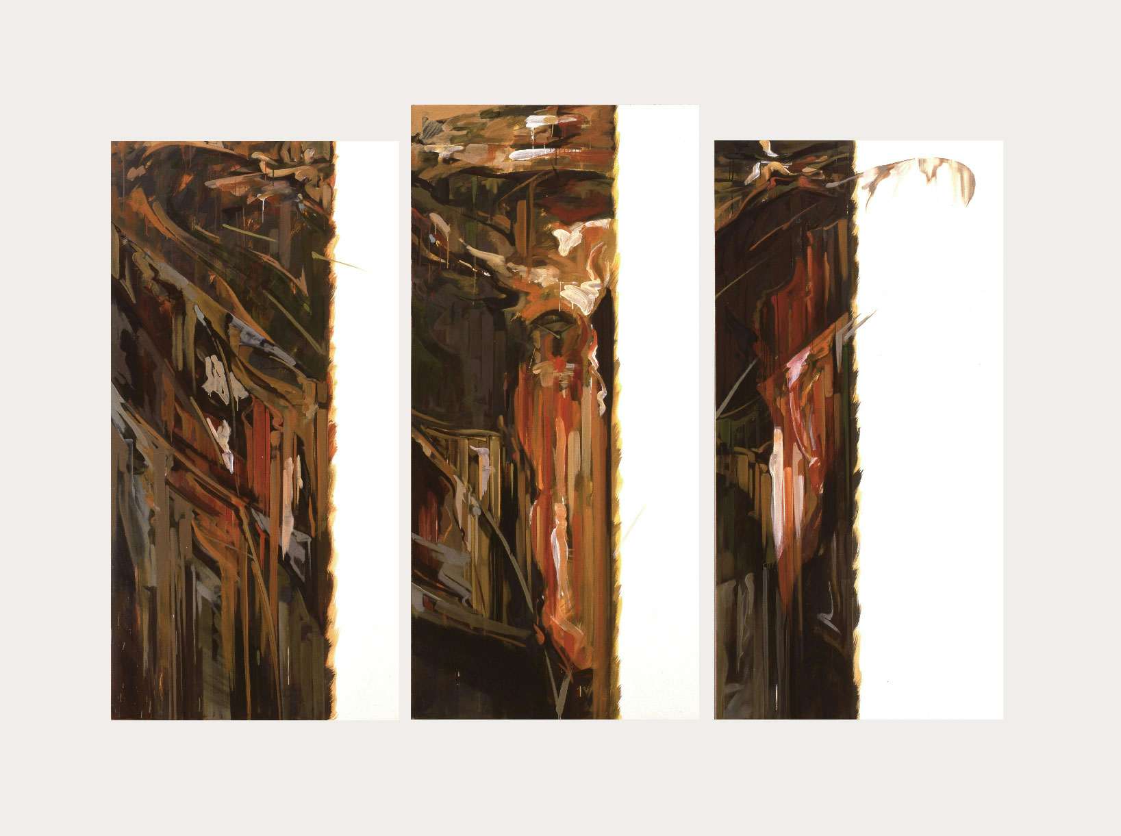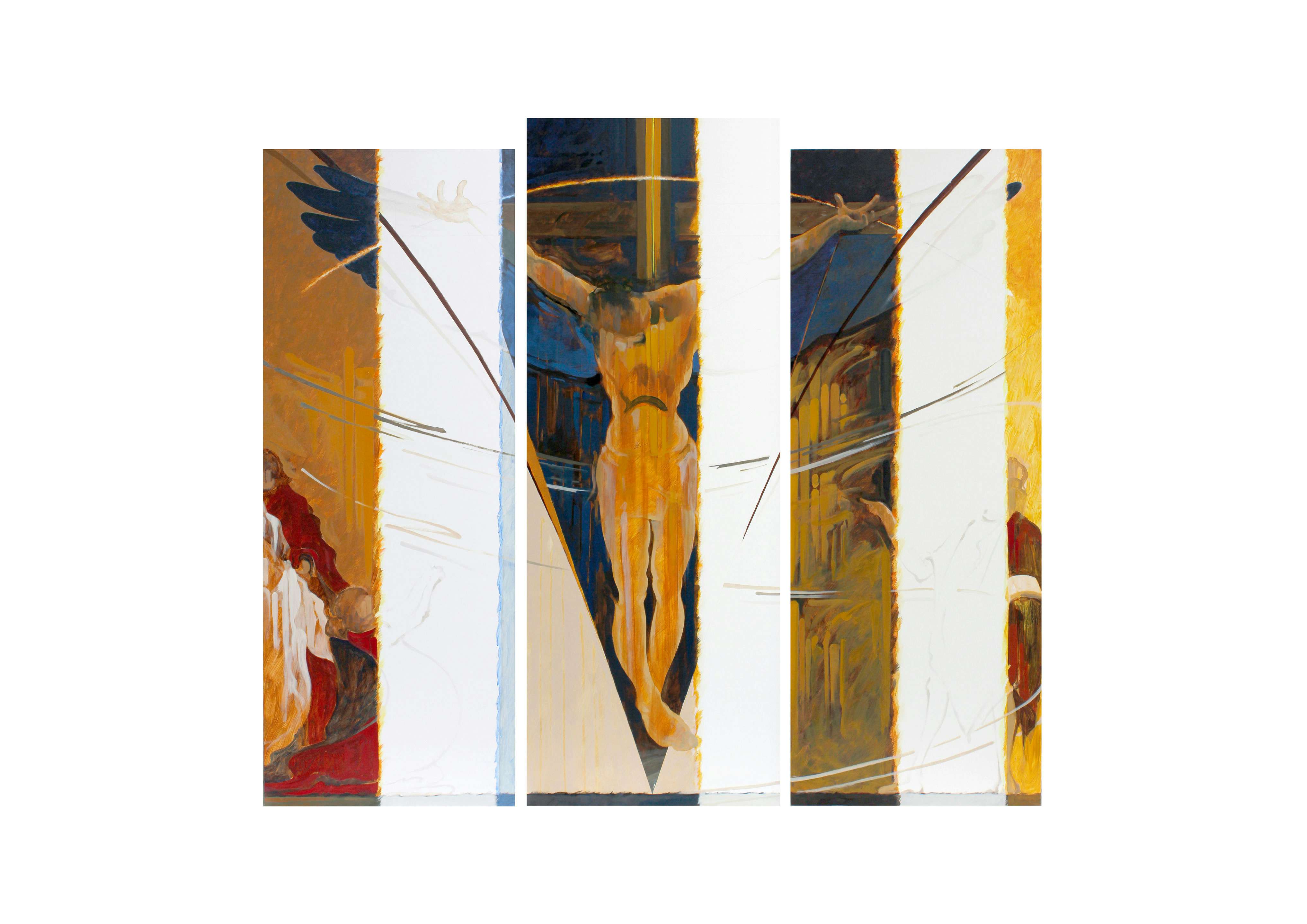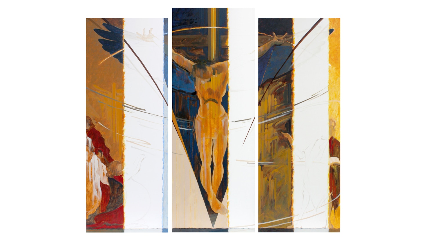本展の起点となる絵画《ta・KK・ei》は、16世紀初頭にドイツ・イーゼンハイムで、画家のグリューネヴァルトが、ペストなどの治療を行う施療院のために描いた歴史的絵画《磔刑図》から着想を得たもの。絵画と精神性について探求を続ける母袋は、西洋の祭壇画が「奇数連結」であり、東洋の障屏画が「偶数連結」であるという形式の違いに着目し、1998年に3枚組の磔刑図《ta・KK・ei》を制作した。そして2020年、新型コロナウイルスが世界的に流行するなか、画家は新たな《ta・KK・ei》に取り組んだ。