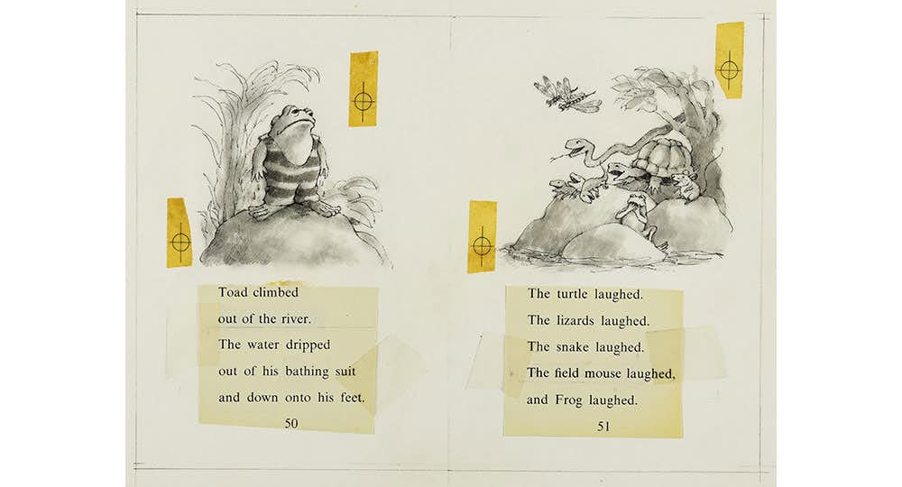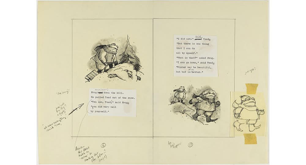 エリック・カール絵本美術館との共同企画となる本展は、「がまくんとかえるくん」の4部作『ふたりはともだち』『ふたりはいっしょ』『ふたりはいつも』『ふたりはきょうも』のスケッチ約100点を初公開。絵本『ふくろうくん』や『ローベルおじさんのどうぶつものがたり』などの隠れた名作も加え、ローベルの絵本約30冊を貴重な原画やスケッチとともに紹介する。