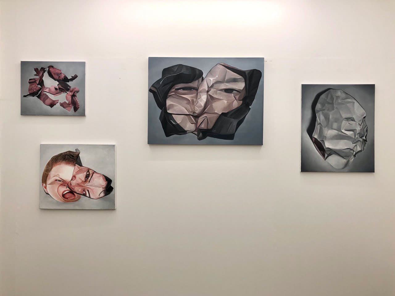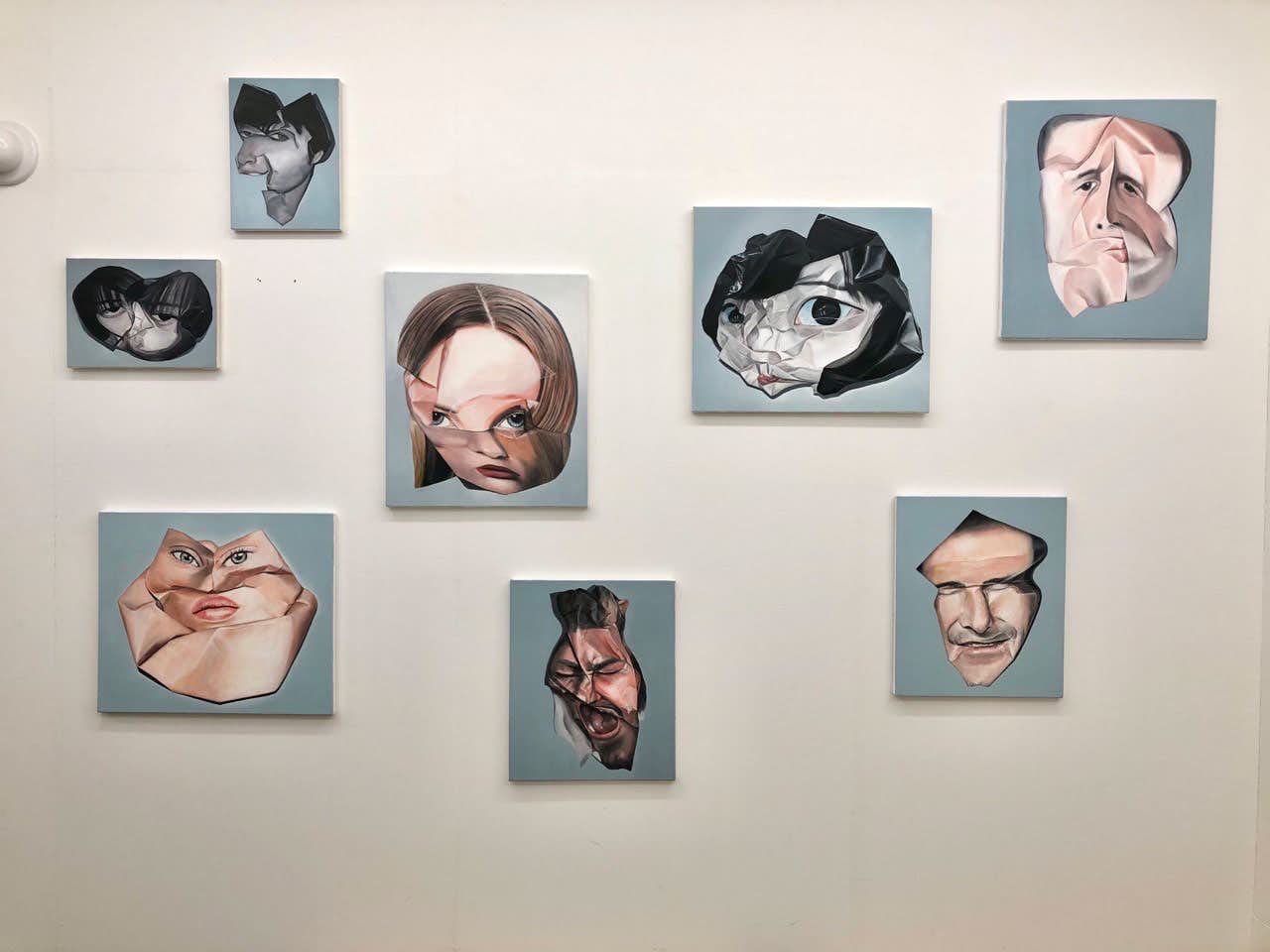 同シリーズでは、まずウェブサイトから集めたどこの誰ともわからない顔の画像をプリントアウトする。それをくしゃくしゃに造形した後に撮影し、写真を絵画として描き直す。制作プロセスの内に、サンプリングから立体造形、立体造形から写真、写真から絵画という異なる表現形式の横断によって作品が成り立っている。