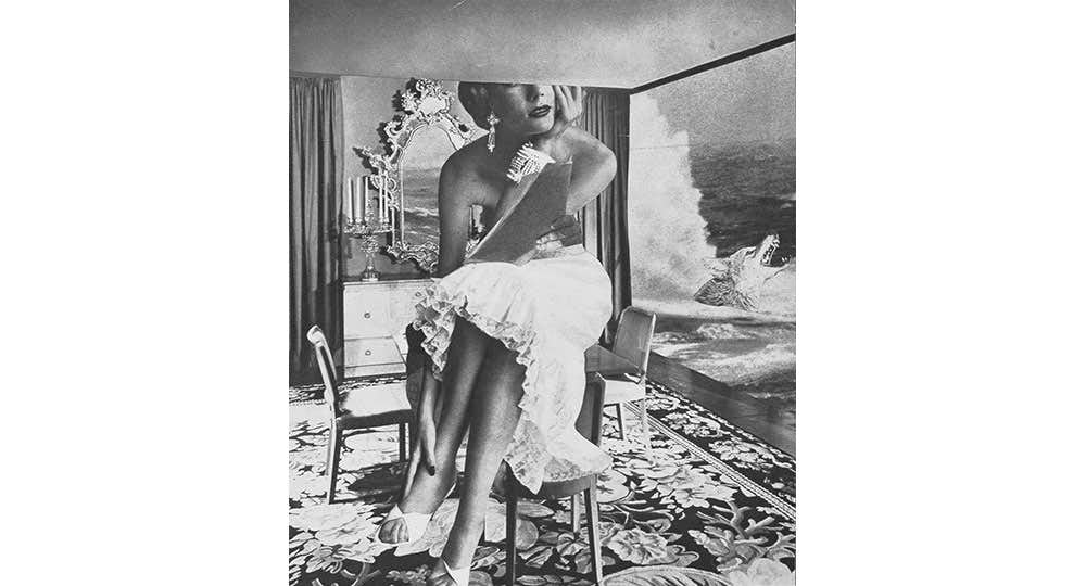 岡上は1928年高知県生まれ。戦後にアメリカの進駐軍が残した『LIFE』や、『VOGUE』『Harper's BAZAAR』などの雑誌を素材にフォトコラージュ作品を制作。戦後の風景をとらえた写真と、モードなファッションに身を包んだモデルの写真の切り抜きからなる独自の世界観を確立し、美術評論家・瀧口修造に才能を見出されるも、美術界から突として姿を消してしまう。