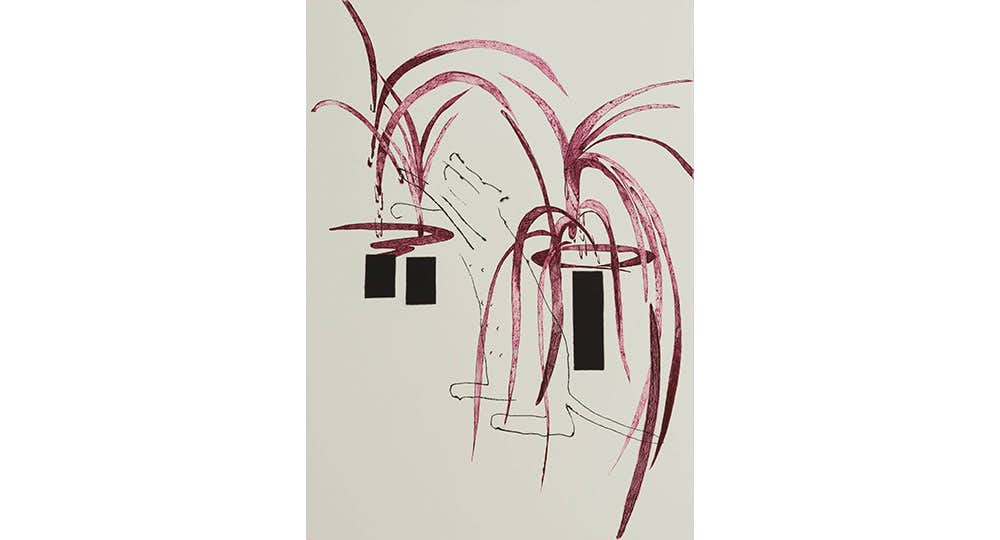 宮田は1986年三重県生まれ。京都市立芸術大学大学院を修了後、主に京都で制作・発表を続けてきた。その作品は一見、アクリル画のように色鮮やかで、ドローイングのように軽快な印象だがすべて版画。版画技法のなかでも凹版画に分類されるドライポイントを用い、主に塩ビ板を彫り、プレス機でイメージを刷る。塩ビ板は、刷る際の圧力に弱いため数多く制作できないいっぽう、木版画や銅版画に比べてインクの発色が良く、独特なにじみが特徴だ。