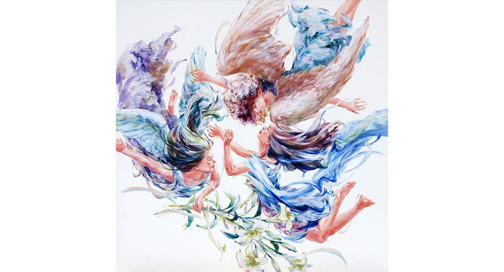 大胆な筆跡とキャンバスの白地を活かして、宙に浮くかのように振る舞う少女たちを描く笠井麻衣子。受胎告知を題材とした作品では、少女と天使、白鳩、白百合の花をモチーフに、物語に独自の視点や解釈を取り入れながら新たな物語を紡ぐことと絵画の関係性の本質に迫る。