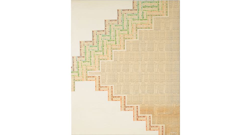 三島は1932年⼤阪府⽣まれ。50年代より伊藤継郎のアトリエに通い絵画の制作を開始。その後、三島茂司に師事し、新聞紙、雑誌、⾺券、蚊帳など、印刷物や廃材を使⽤した実験的なコラージュ作品に取り組む。54〜69年にかけて出展した独⽴展(東京都美術館)では⼤阪市賞(1961)、独⽴賞・須⽥賞(1963)を受賞し、64年には「現代美術の動向―絵画と彫塑」展(国⽴近代美術館京都分館)に出品。その他、関⻄独⽴展、独⽴新⼈選抜展、朝⽇新⼈展などに出展し、⽇本の前衛美術において画家として頭⾓を現した。