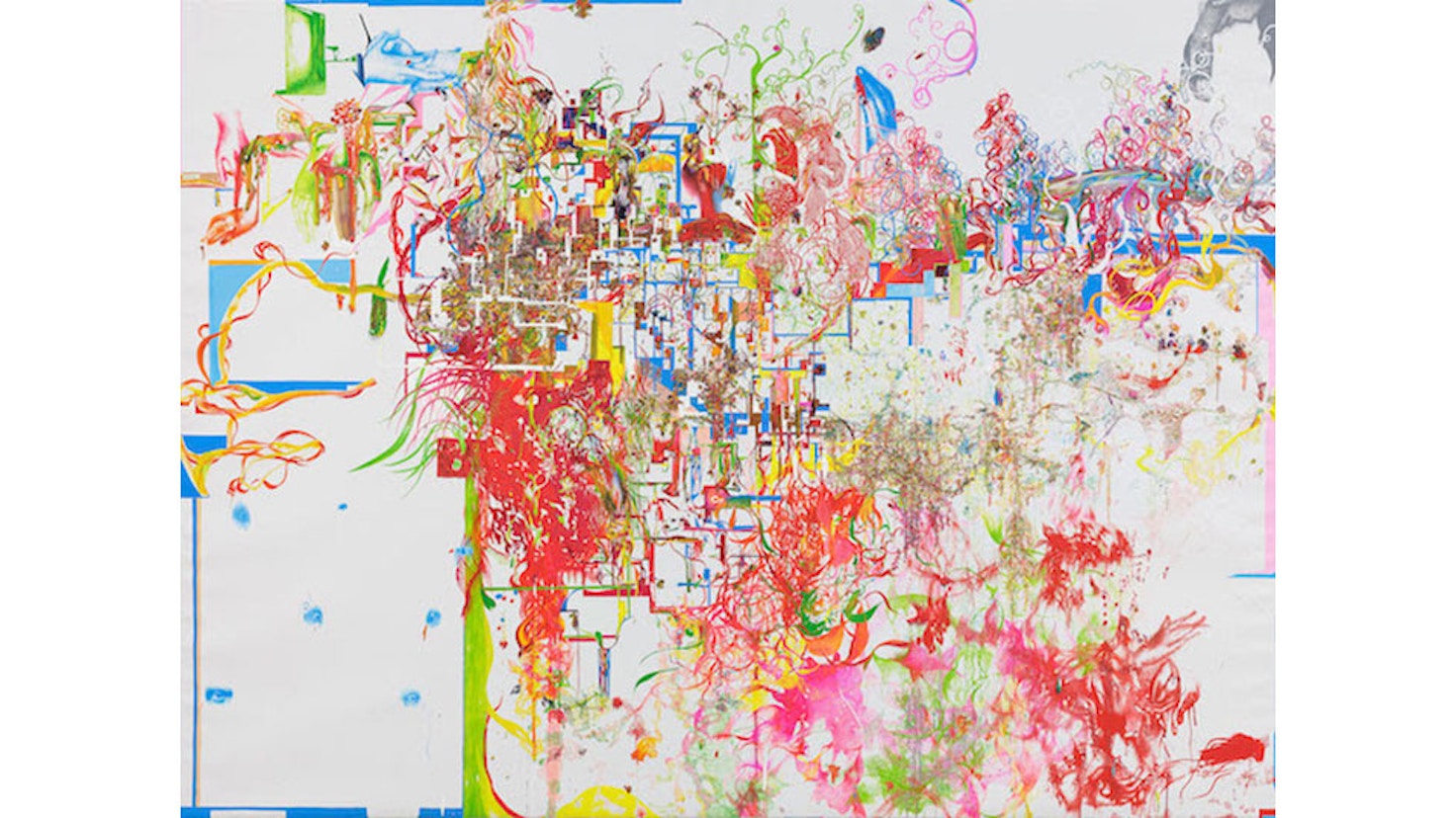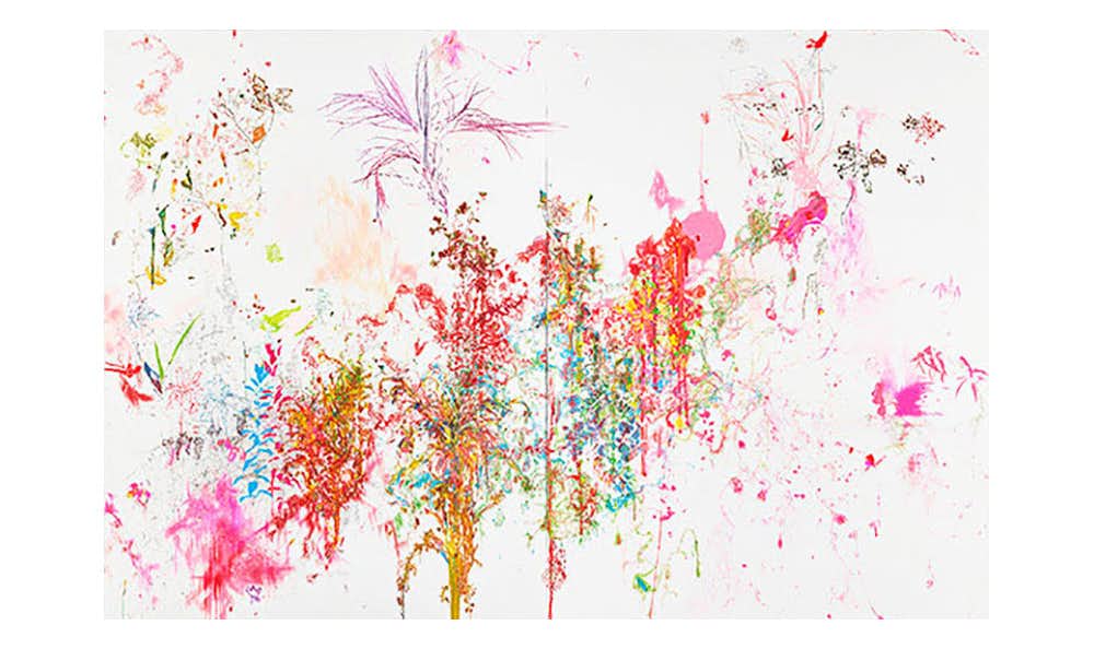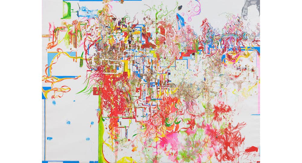 大きなキャンバスに、面相筆(穂先のきわめて細長い筆)で色面や線を一筆一筆重ねて描き上げる緻密さと、ドリッピングによる絵具の跳ねや垂れの偶然性を共存させた作品は、絵具の色の鮮やかさや盛り上がりと白いフラットな部分の対比も合わさり、躍動感と迫力を生み出している。