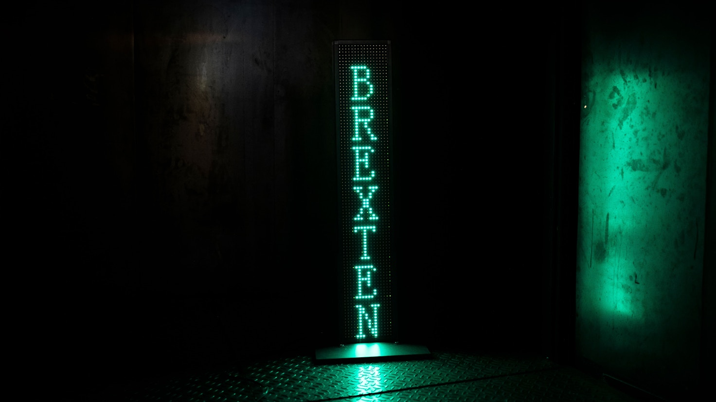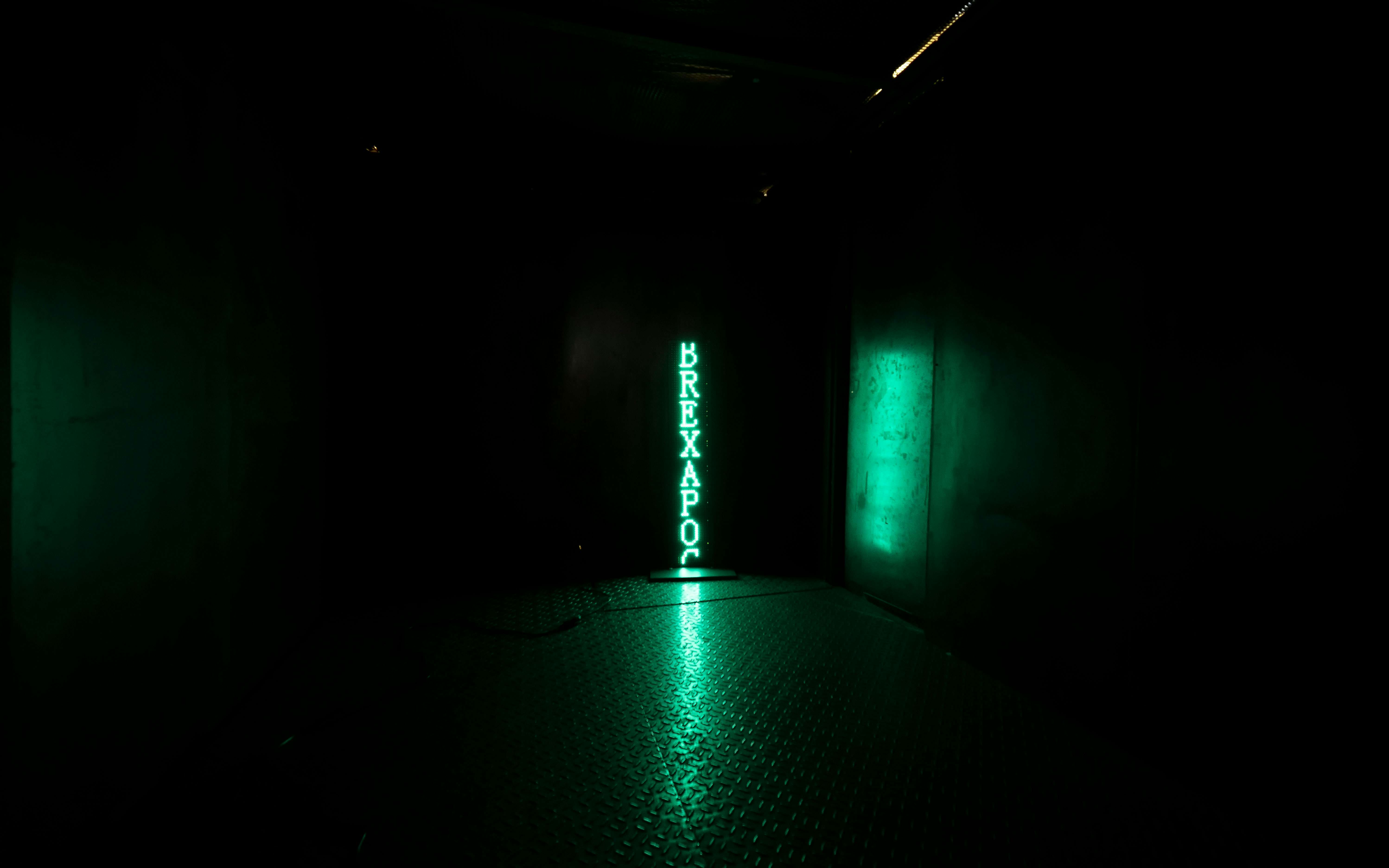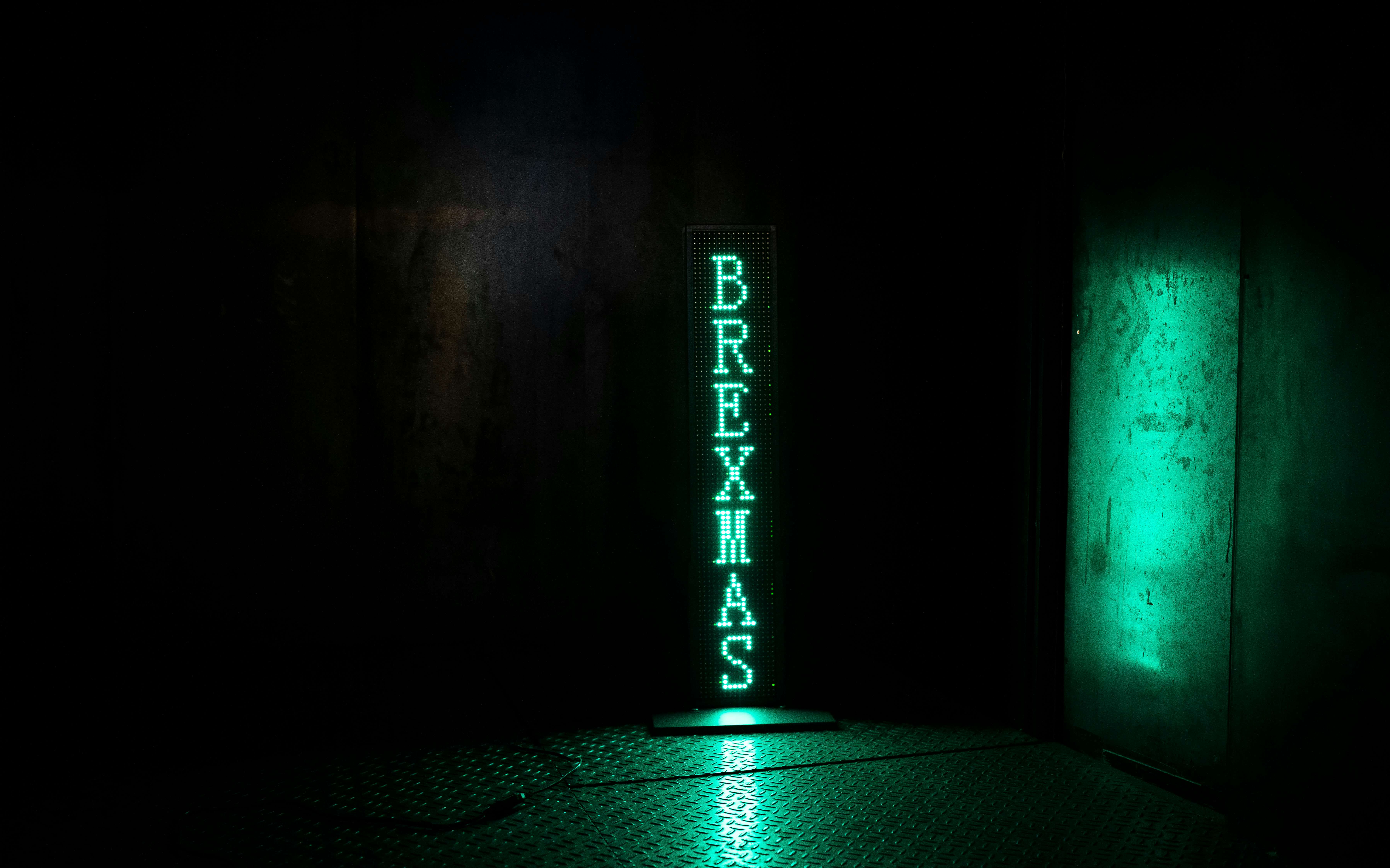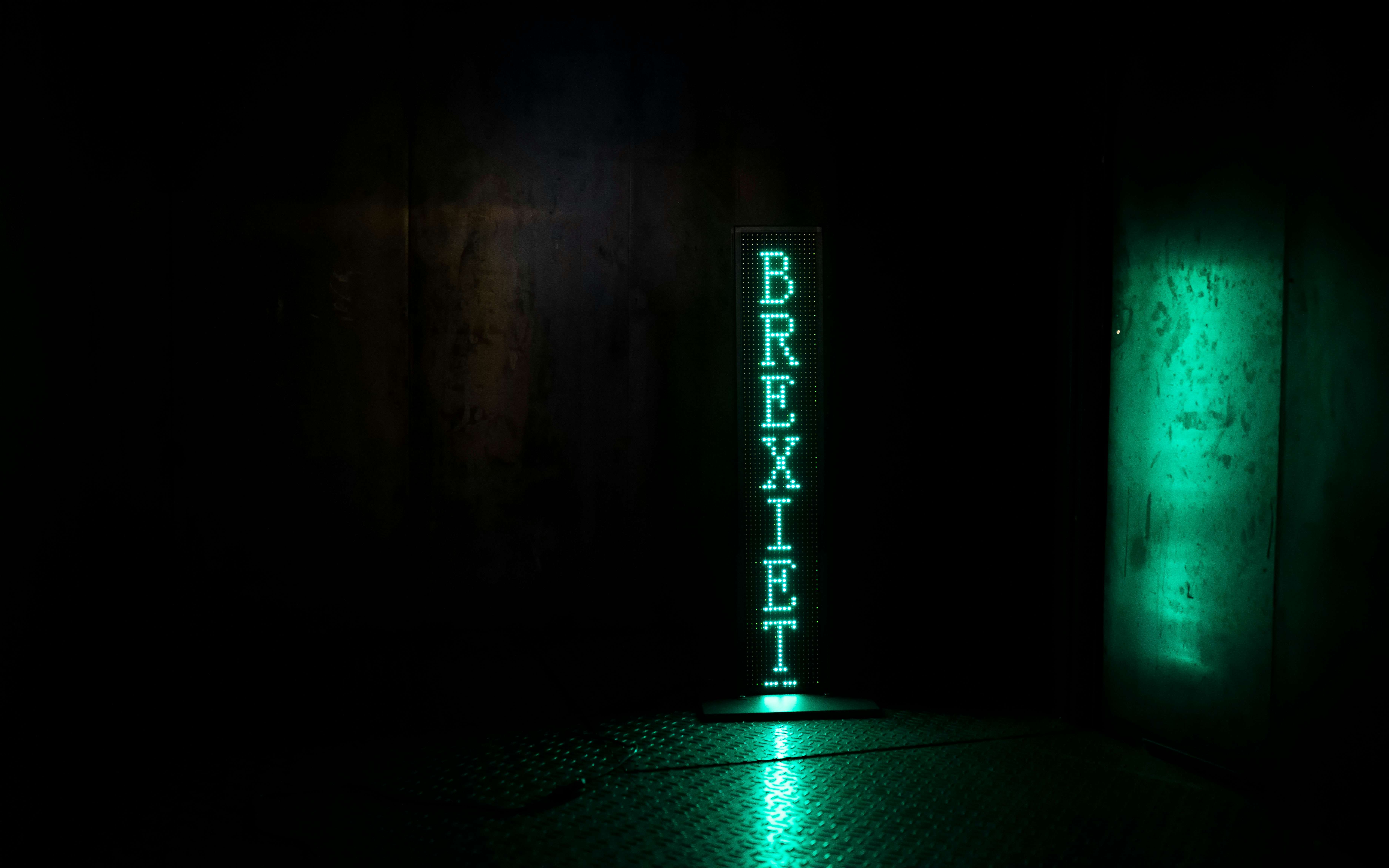本展では、インスタレーション《ブレグシット・マシン》を発表。「BREXITED」「BREXAGEDDON」「BREXIETY」などの「ブレグジット用語」が緑色のLEDで照らされる。