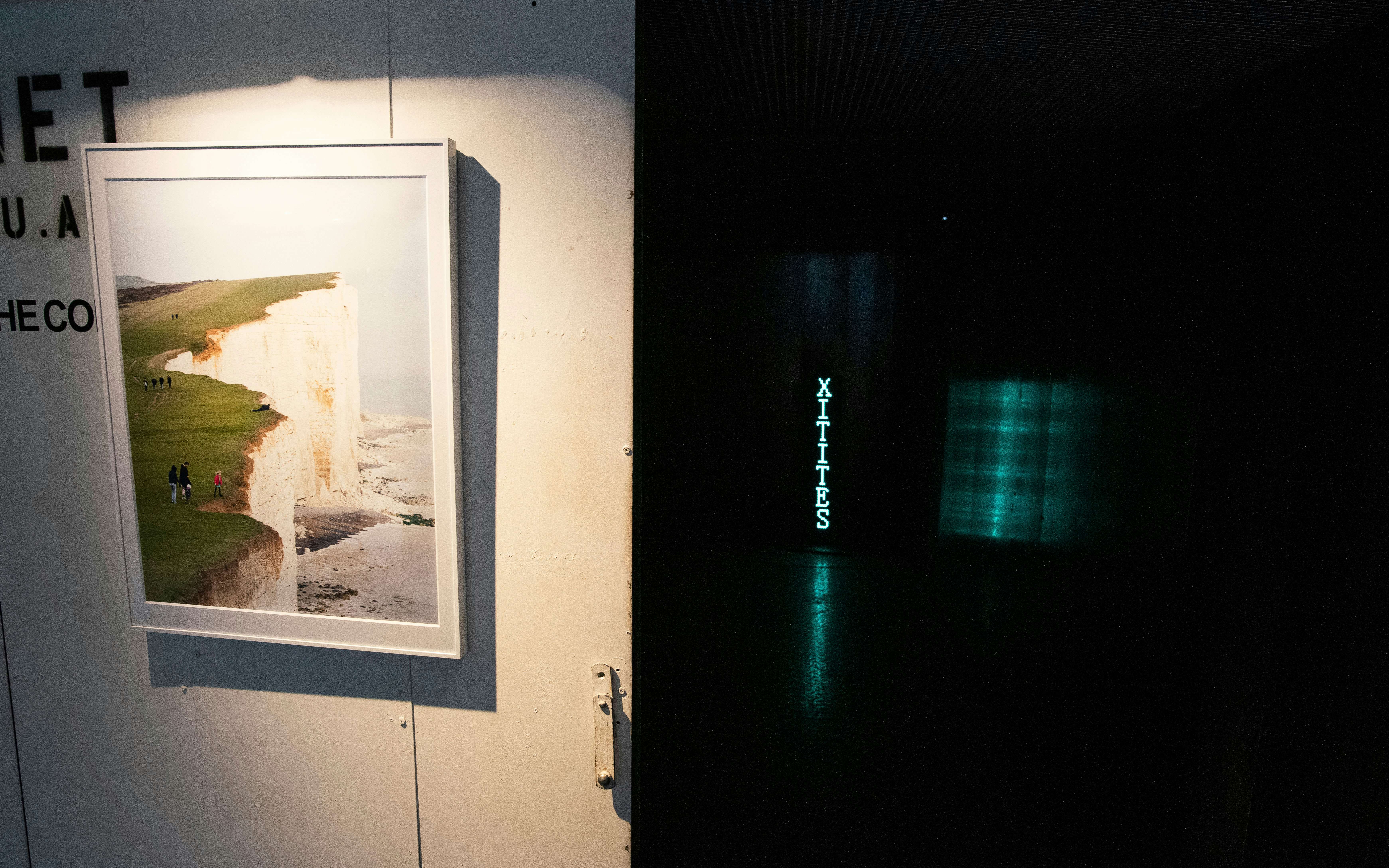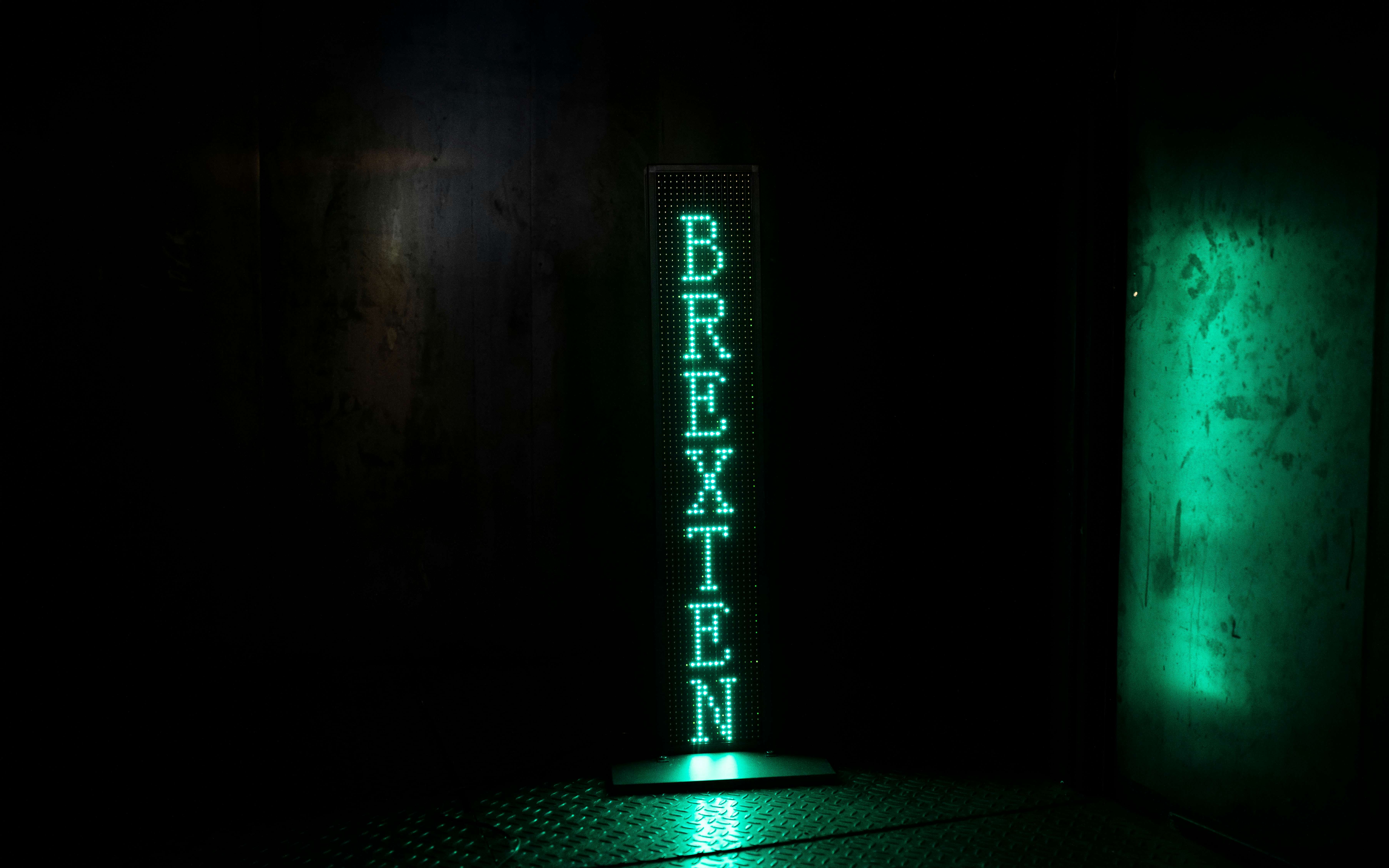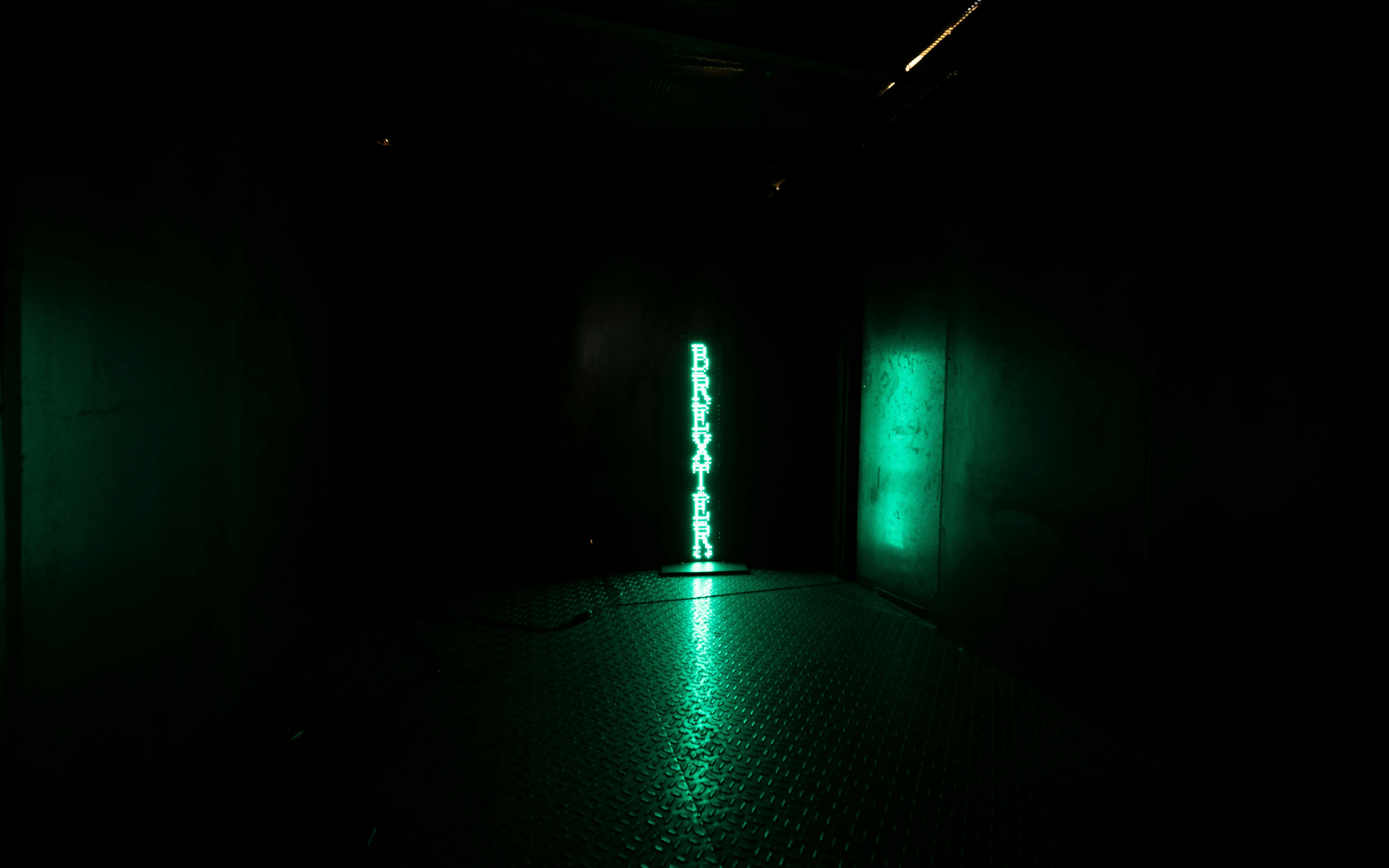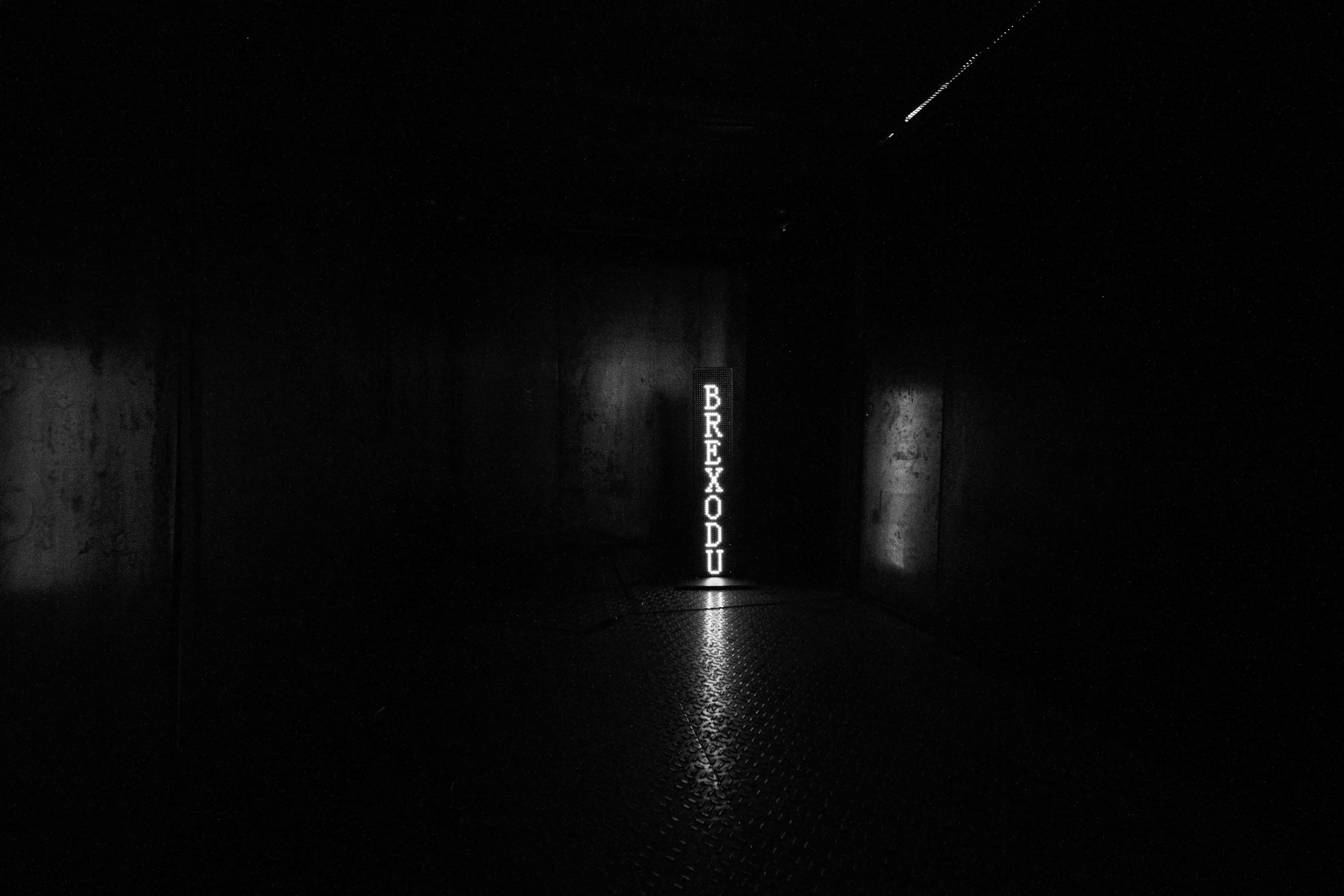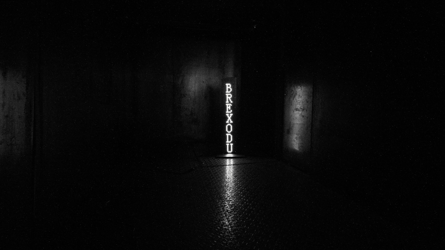 本展では、インスタレーション《ブレグシット・マシン》を発表。「BREXITED」「BREXAGEDDON」「BREXIETY」などの「ブレグジット用語」が緑色のLEDで照らされる。