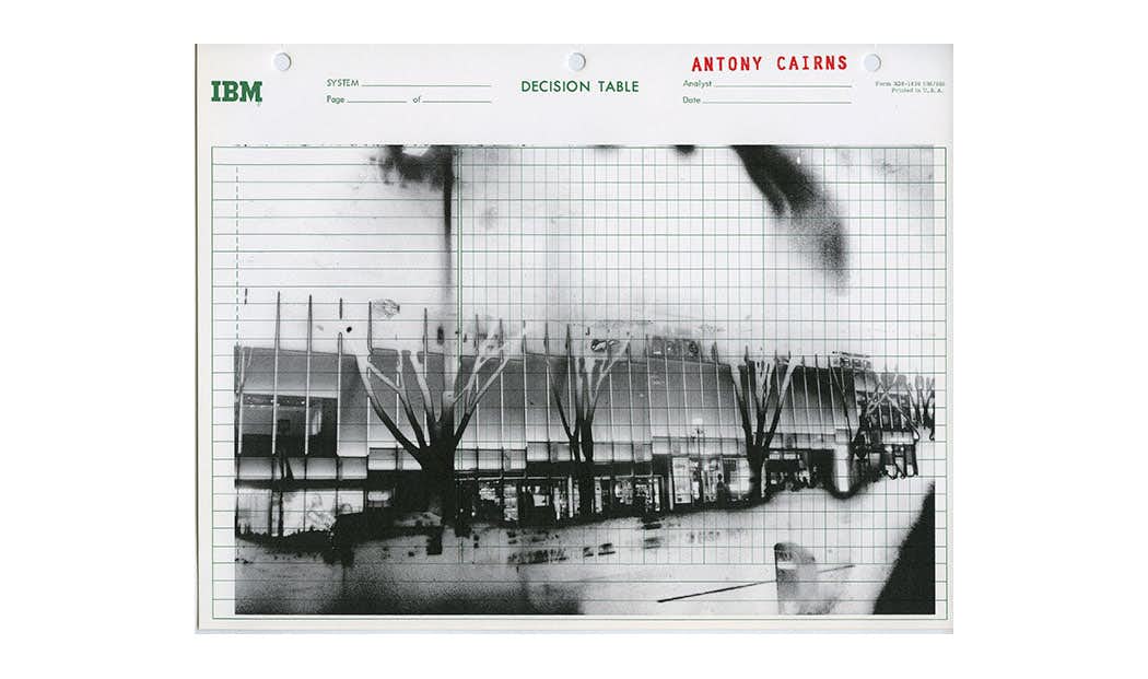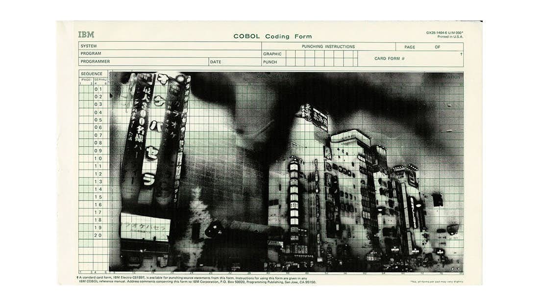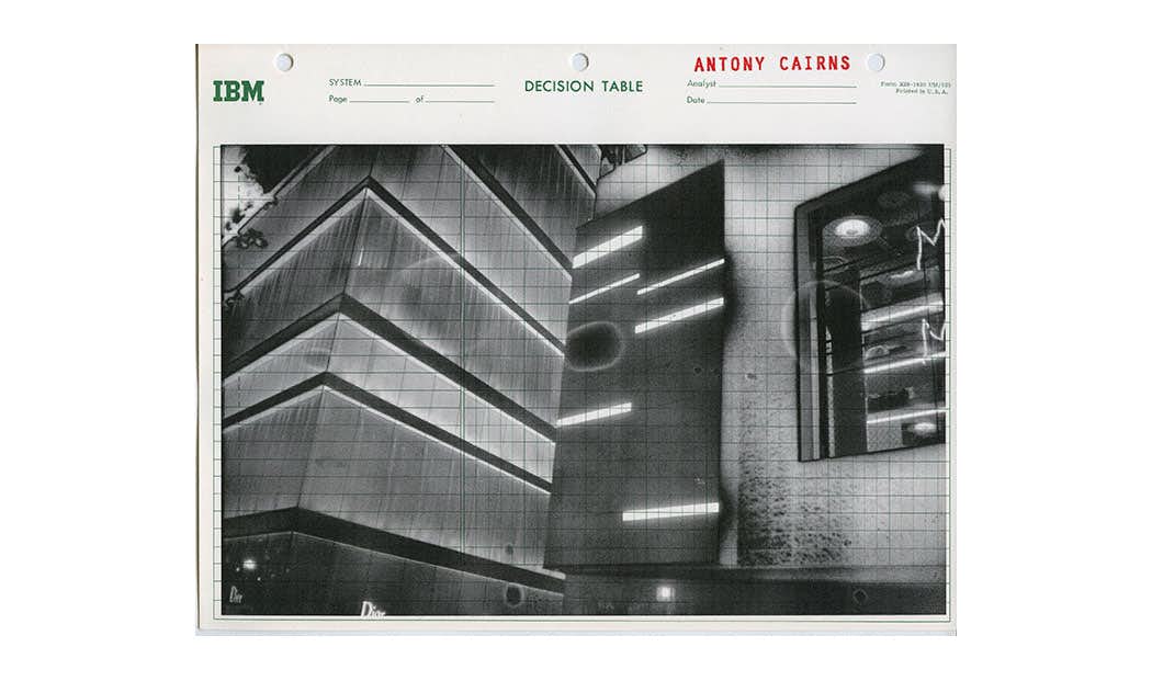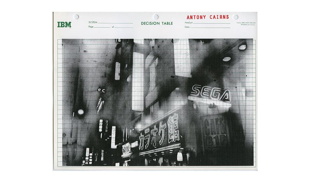 ケアンズは、イメージの撮影、暗室でのイメージ操作、支持体および印刷プロセスを慎重に選び、ひとつのイメージをユニークなオブジェとして結実させてきた。今回、ヴィンテージコンピュータ用紙の上に乗せるイメージを検討した結果、東京の夜の風景が選ばれた。