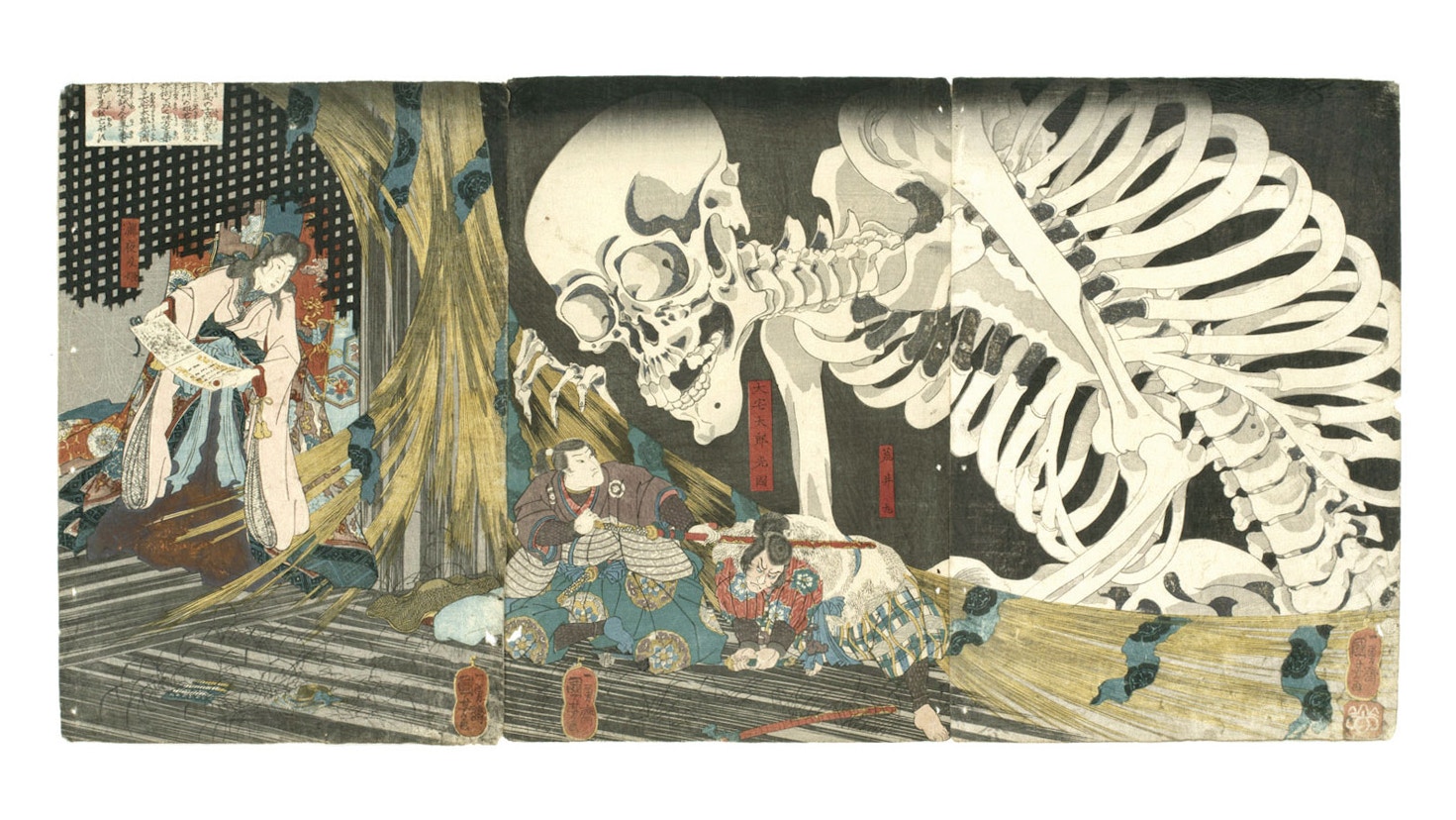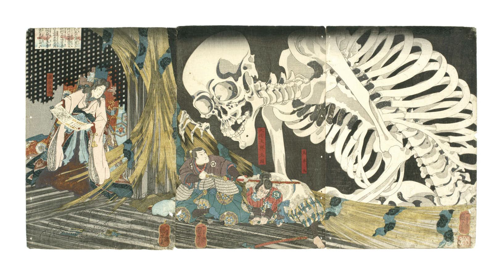 歌川国芳は、武者絵で人気を博した絵師。歴史画、説話画など多彩な画題を手がけ、大判錦絵を3枚並べたパノラマ画面を活かして、豊かな表現力で臨場感あふれるダイナミックな浮世絵を展開した。また、国芳の門下の筆頭である月岡芳年は、高度な描写力による残虐絵や美人画で再評価され、「最後の浮世絵師」とも呼ばれている。
