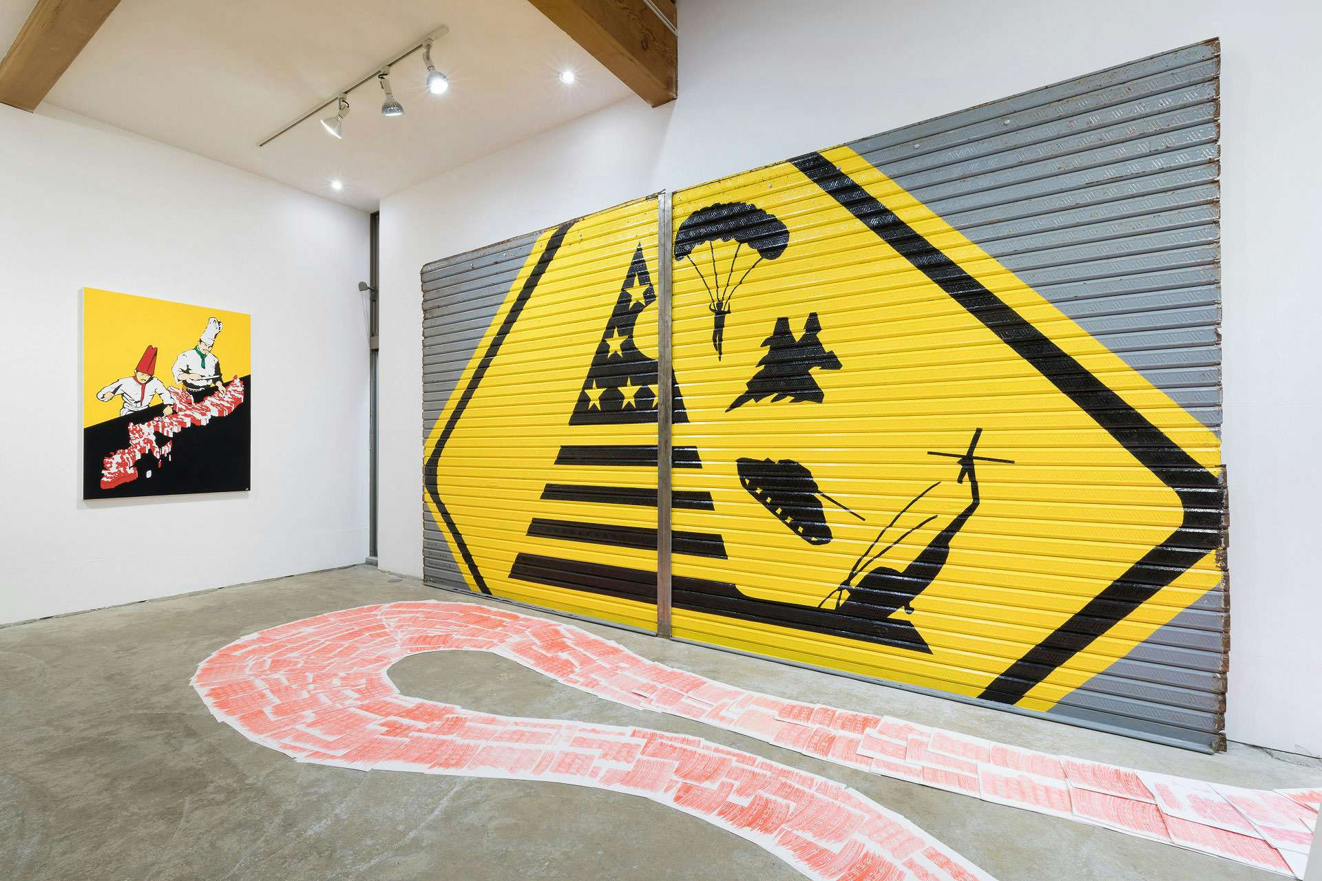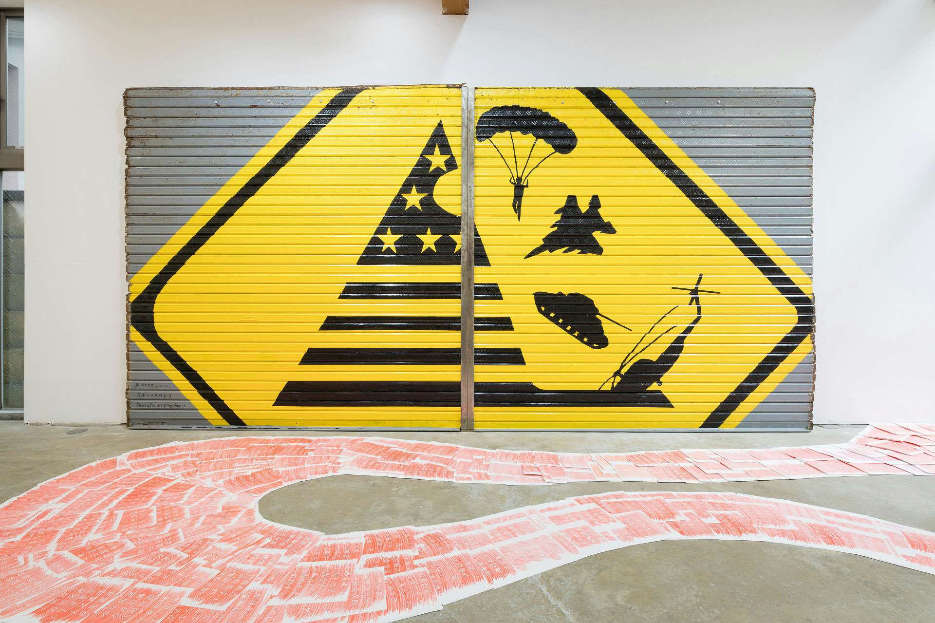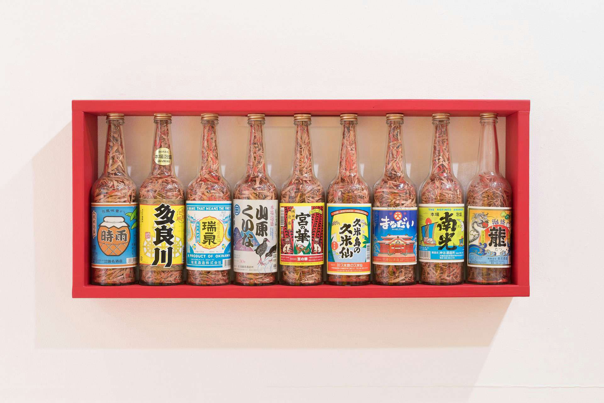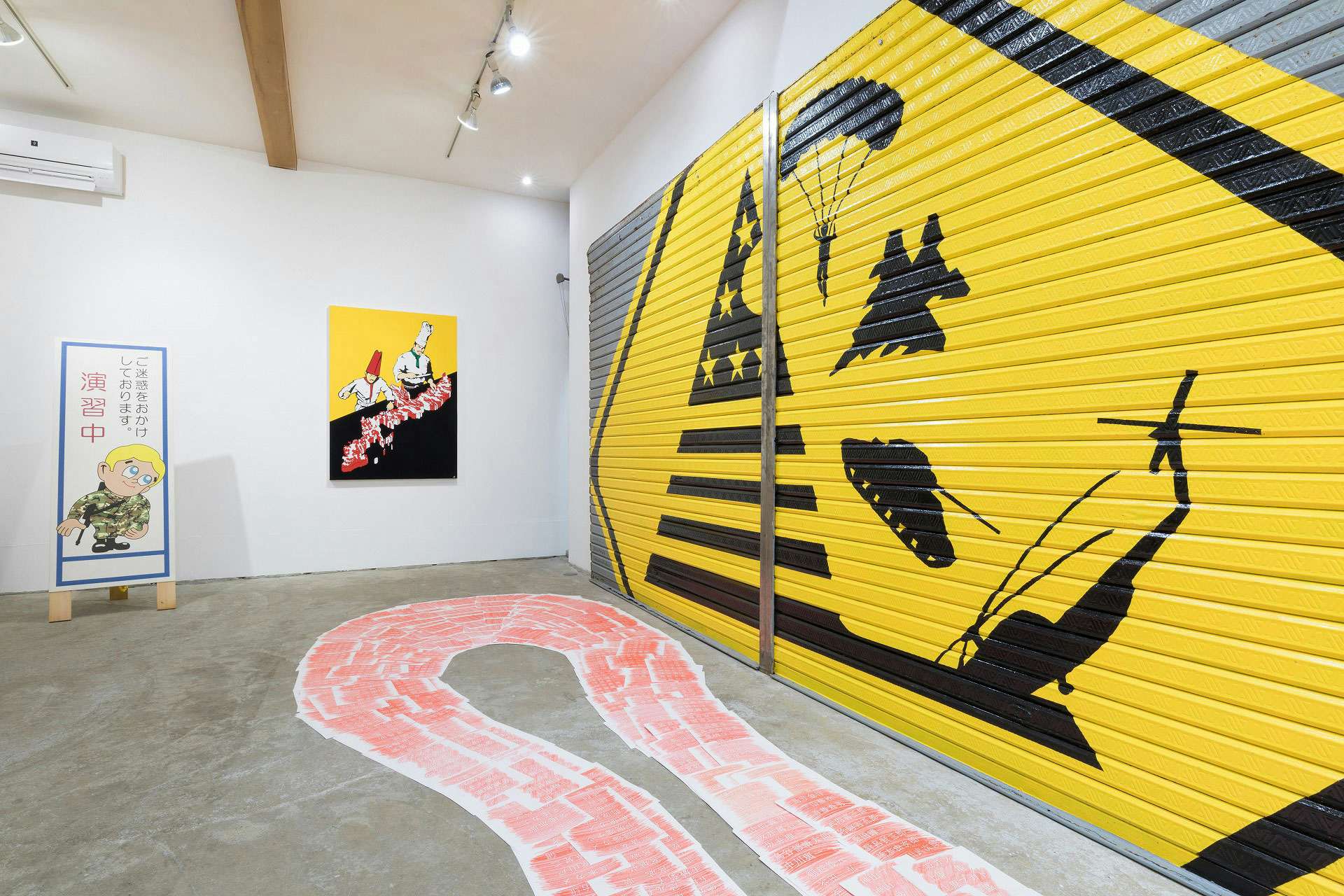 展示は、岡本によるパフォーマンス《漫湖へ》を収めた映像作品《to MANKO》から始まり、現代の沖縄の光景を出発点に戦時下の犠牲者たちの念を定着させた《赤絨毯》、そのガイドに沿って、沖縄が抱える問題をテーマにした《OKINAWAN STEAK》や《落米のおそれあり》を配置。堆積した時間/遺志と、侵食される現状/意思を相互に作用させながら、沖縄という地域を観念的に遡行/観光していくような構成で、岡本作品の本質を伝える。