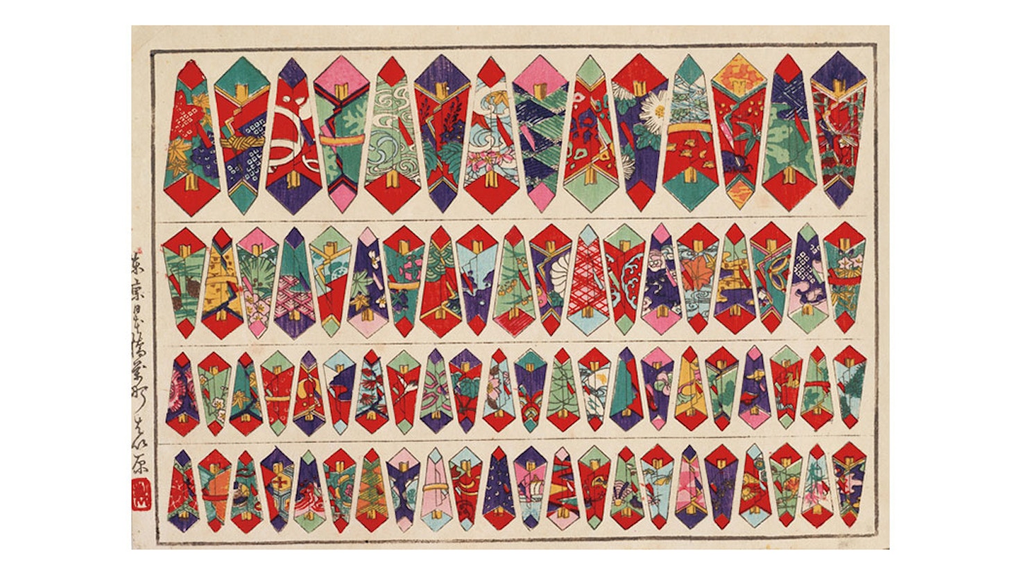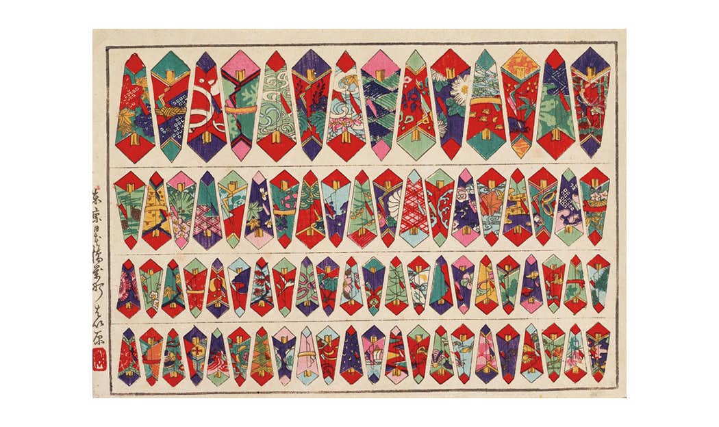 榛原は1806(文化3)年、江戸日本橋に「雁皮紙(がんぴし)」の暖簾(のれん)を掲げた老舗。熱海産の雁皮紙をはじめとする良質な和紙で江戸中にその名を知られ、また絵半切れや熨斗(のし)などの「小間紙(こまがみ)」も扱った。なかでも木版摺りの千代紙は、その鮮やかさと精緻な摺りが評判を呼び、明治期の万国博覧会にも出品された。