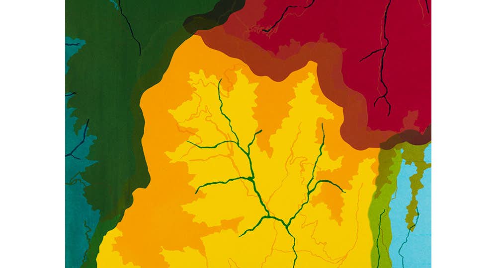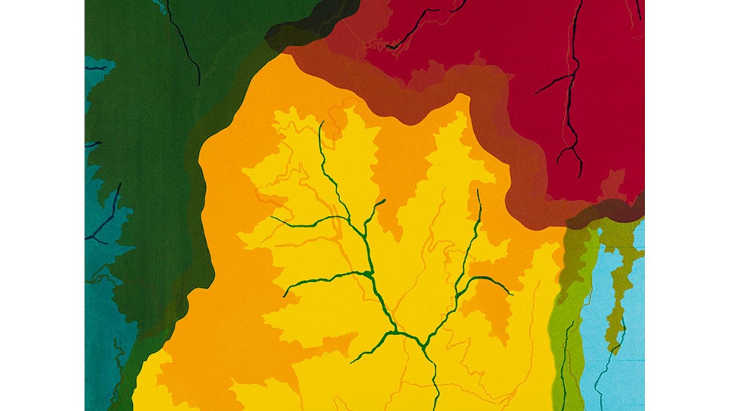 本展で展示されるのは、シルクスクリーンや光など、油絵以外のメディウムも積極的に取り入れた作品群。木曽の地図をベースに流域や道路、行政区の地理的情報に4色の色面がシルクスクリーン印刷された新作《Water mark》は、一枚一枚の版のレイヤーが微妙にずらされることにより、それぞれの色面の境界線が侵食しあいその境界を曖昧にする。研ぎ澄まされた色彩感覚を用いつつも、つねに次代の表現を探究する山本の新境地に注目してほしい。
