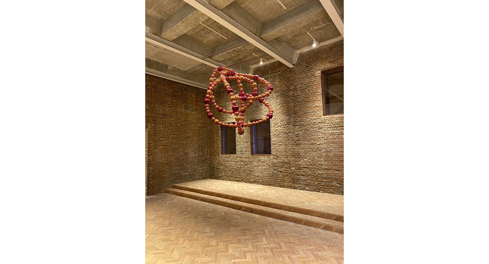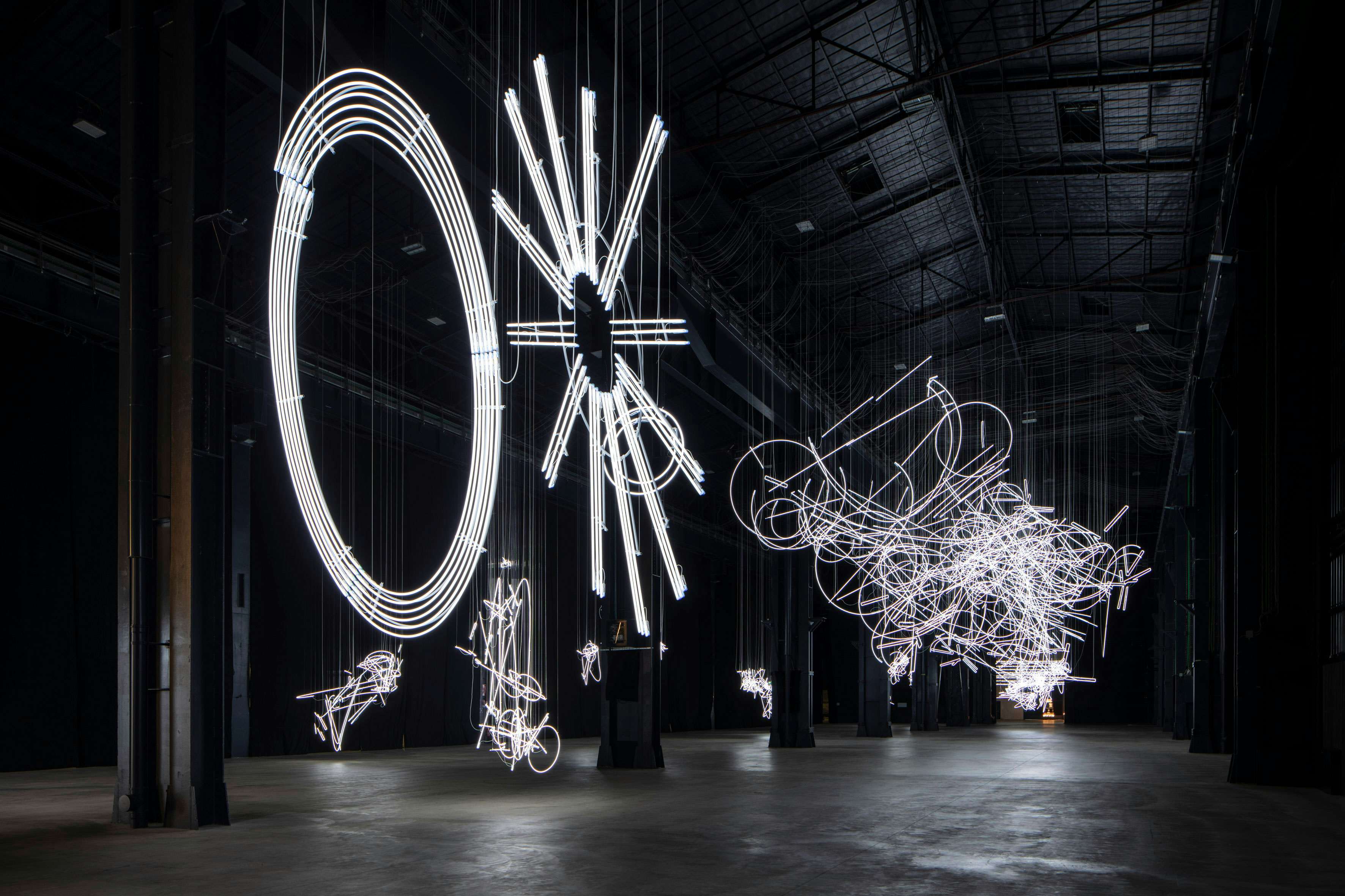2019年に弘前を訪れてリサーチを行ったエヴァンスは、青森の地で出会った「りんご」から着想を得て、弘前れんが倉庫美術館の吹き抜けに合わせたネオン管による《Drawing in Light(and Time)....suspended》を構想。りんごの断面のフォルムから万有引力の公式、惑星の軌道といった象徴的なイメージやモチーフをグラフィカルに組み合わせた灯(ともしび)、あるいは光のトーテムのような巨大な彫刻作品を生み出した。