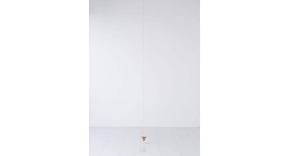 小清水の《垂線》はただひたすら、床にある一点を指し示す分銅と、それを支える天井からの垂直線がそれぞれ、彫刻制作の原点と垂直軸を、目に見えるかたちで表現するものだ。本展では2015年に制作した、石を吊るした作品も展示している。
