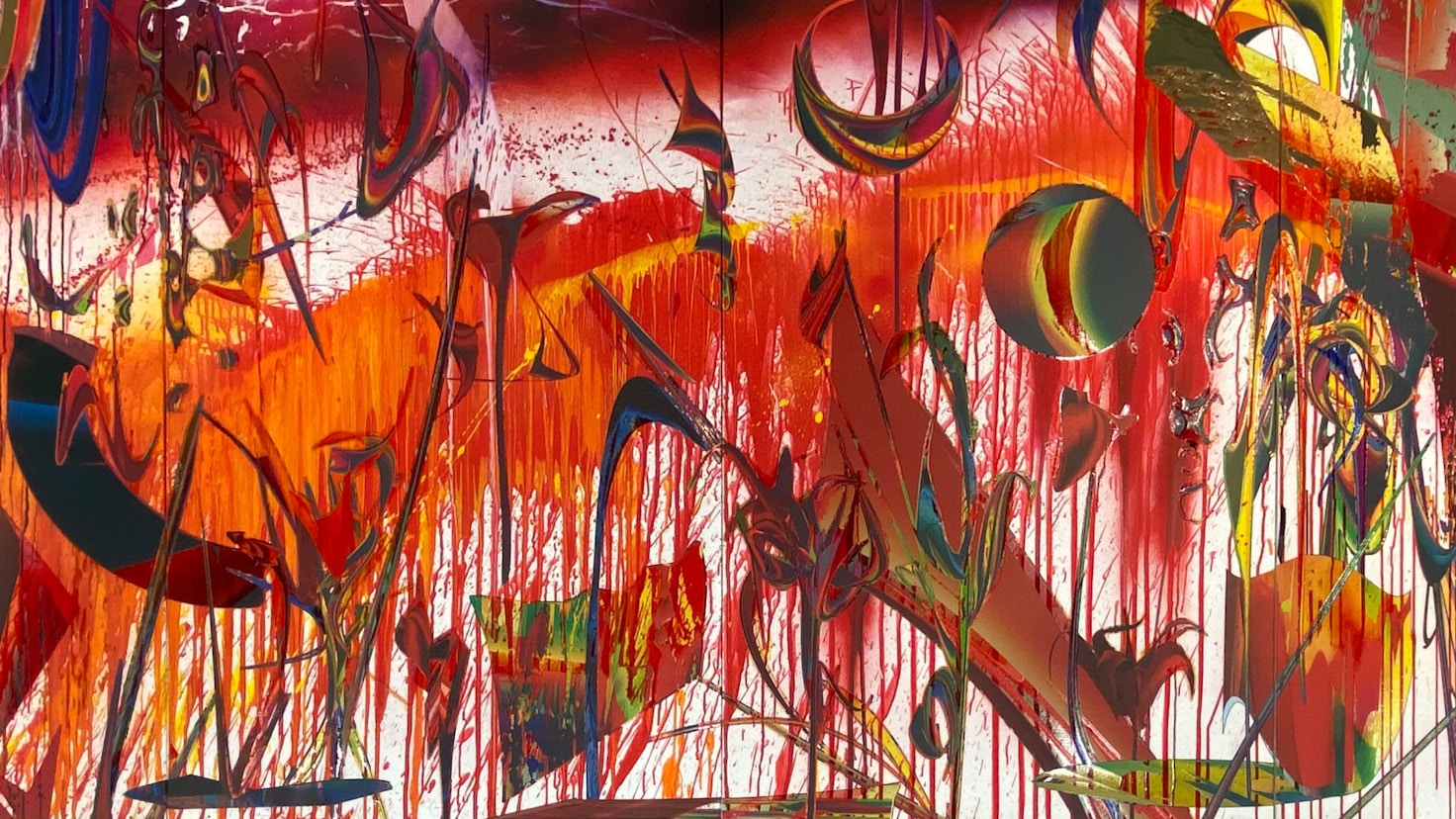 Rei Nakanishiの制作のスタイルは、コンピュータグラフィックスで想起した図柄の上や写真の上に、デジタルでしか再現しにくい動きのある筆致をフリーハンドで⾏うという、グラフィックデザイナーとしての経験と自身がニューヨークで学んだ技法が核になっている。奥⾏きが存在しないデジタルからインスピレーションを得て、絵画というアナログの存在感へと落とし込むことで、現代にしかできない表現を追求している。