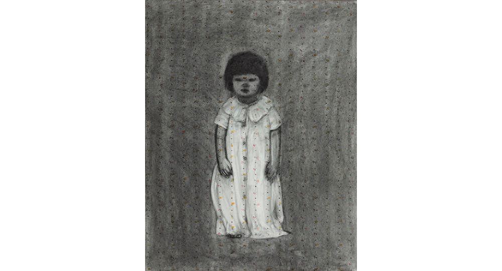それから作家は、瀬戸への引っ越し、第二子の出産などの生活の変化に加え、17年に参加した「リアル(写実)のゆくえ」展(平塚市美術館ほか)において日本近代絵画への新たな視点を得たと言う。安藤は制作を重ねるなかで、自身が見ているのは、人の表情や着ている服の柄、その人の居る状況や気配といったものだと気づき、その空気感を大きくつくる感覚と状況の細部、その双方をいかにして実現させるかということが作品の重要な主題のひとつとなった。そしてまず自身の感覚に合ったのは、木炭紙に木炭で描くことだった。