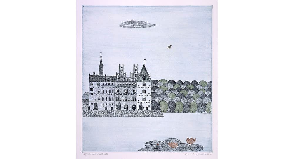 南は1911年富山県高岡市生まれ。高等女学校時代から絵画や詩作に親しみ、戦後は東京に出て油彩画を発表。そのなかで、のちに20世紀を代表する銅版画家となる浜口陽三と出会い、銅版画の魅力を知った。それから1953年にフランスへ旅立ち、現地で版画を学んだ南は、鳥、城、女の子など童話のようなモチーフと、静かな色合いの抒情あふれる作品を制作し続けた。