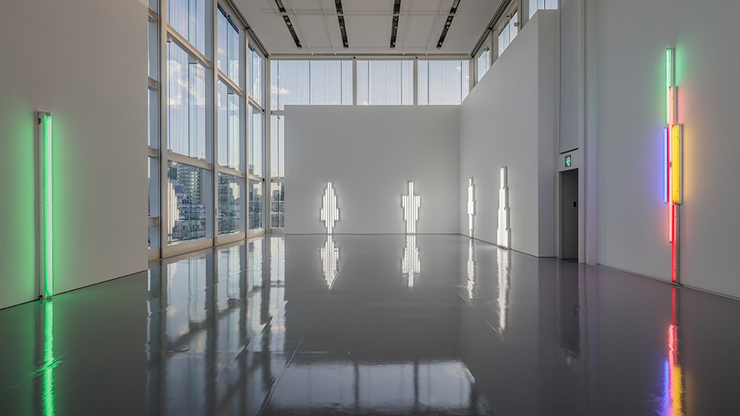 1960年代にミニマリスト運動を主導し、光そのものを作品に用いたダン・フレイヴィンの個展が開催される。フレイヴィンは61年から63年にかけて制作した『Icons(イコン)』シリーズで初めて「光」を使用。8枚の四角いキャンバスに電球と蛍光灯を取り付けたこの一連の作品は、その後芸術家としての彼のキャリアを形づくり、45 度の角度で壁に取り付けられたゴールドの着色蛍光管が発する長い1本の光の帯──『The Diagonal of May 25, 1963(1963 年 5 月 25 日の斜め線)』が誕生した。作家はそれ以降、4種類のサイズと10種類の色(青・ 緑・ピンク・黄・赤・紫外線、そして4種類の白)の既製品の蛍光灯のみを素材として、これらを改造したり、あるいは装飾を加えたりすることは一切せずに限られた材料を様々に配置した作品を生み出し続けた。