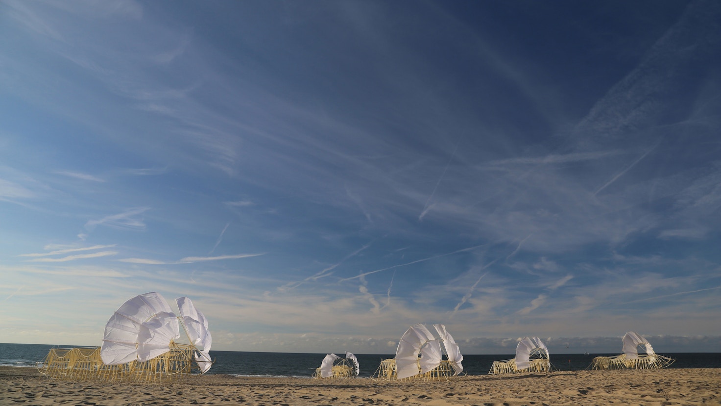 ストランドビーストは、プラスチック・チューブやペットボトル、粘着テープといった身近な材料を組み合わせ、物理学による計算に基づいてかたちづくられた、風力で砂上を歩く生命体。ヤンセンの制作を通して新たな機能を獲得し、それらが生物の進化になぞらえられ、自然との共生、芸術と科学の融合など、様々なことを私たちに伝えてくれる。