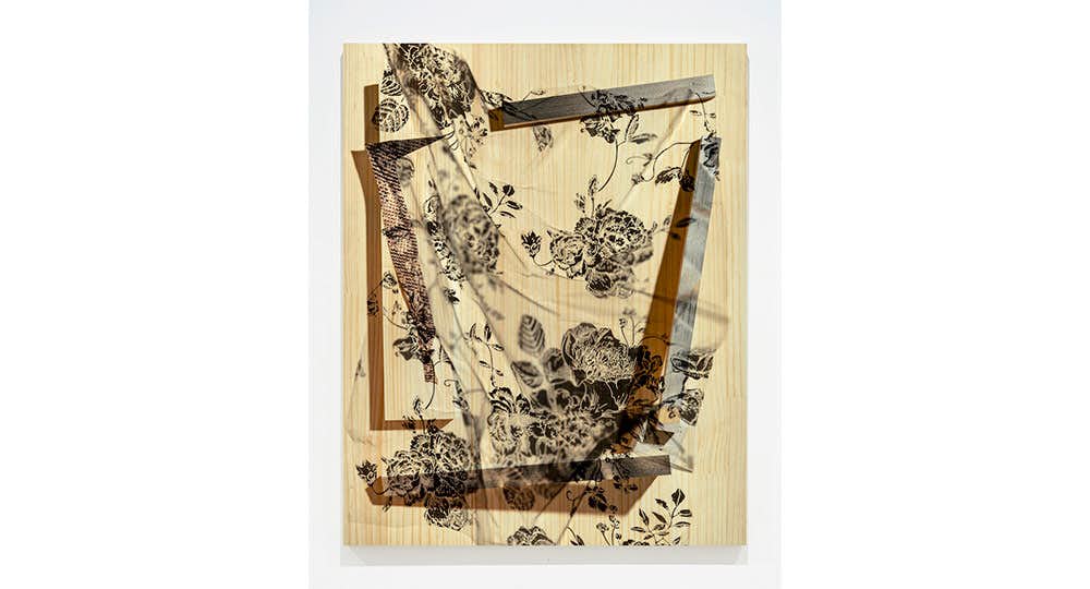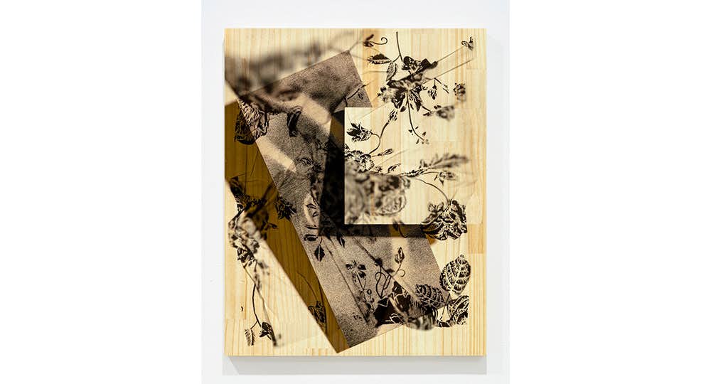 18年のMaki Fine Artsでの個展「ピンク・シャドウ」で初めて発表された作品から発展し、本展の新作は、さらに多重の要素が加えられ、複雑化したレイヤーにより設計されている。画面の中心を構成する花柄やストライプなどのパターンの図は、シルクスクリーンで透明ビニールに柄を刷り、実際にはプリントされた写真の裏側に置かれたもの。裏面から投影されて見える図像と、写真上で随所に構成された木片の陰影とのバランスが、視覚の動線をつくり出し、より立体感のある階層のイリュージョンをつくり出す。