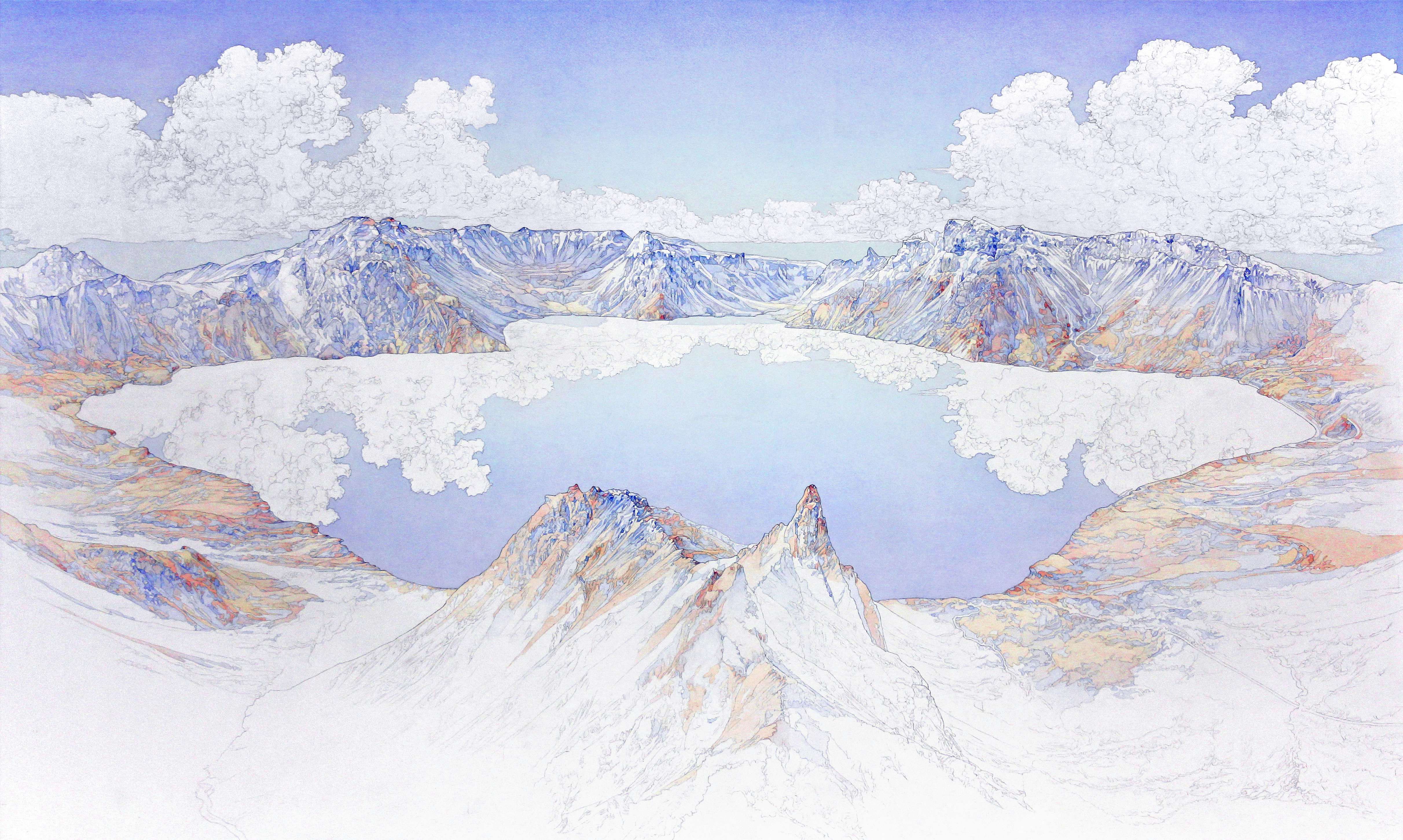本展タイトルの「記号の国」は、フランスの哲学者ロラン・バルトの著書『表徴の帝国/記号の国』から引用したもの。新作を含めた5〜6点の出品作は、例えば富士山や白頭山や漢拏(ハルラ)山、スーツとチョゴリと着物、防護服、日の丸、天池(チョンジ)、葛飾北斎を彷彿とさせる波の線描による海の絵など、強い象徴性を持ったモチーフを使って構成されている。