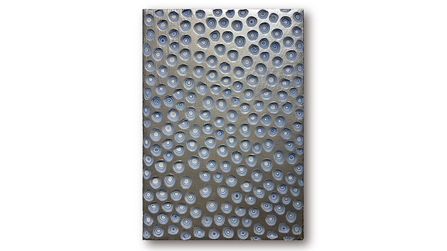 本展では主に銀色を用い、視る角度や光のあたり方で印象が変わることを意識し、近年取組んでいる「平面作品と、彫ることによってできる絵具片の関係を考える」シリーズのなかから、絵具片から形成される器なども展示。彫る絵画と絵具片を様々に形成し、対となる作品は、作家が制作に真摯に取り組んでいることを感じさせる。