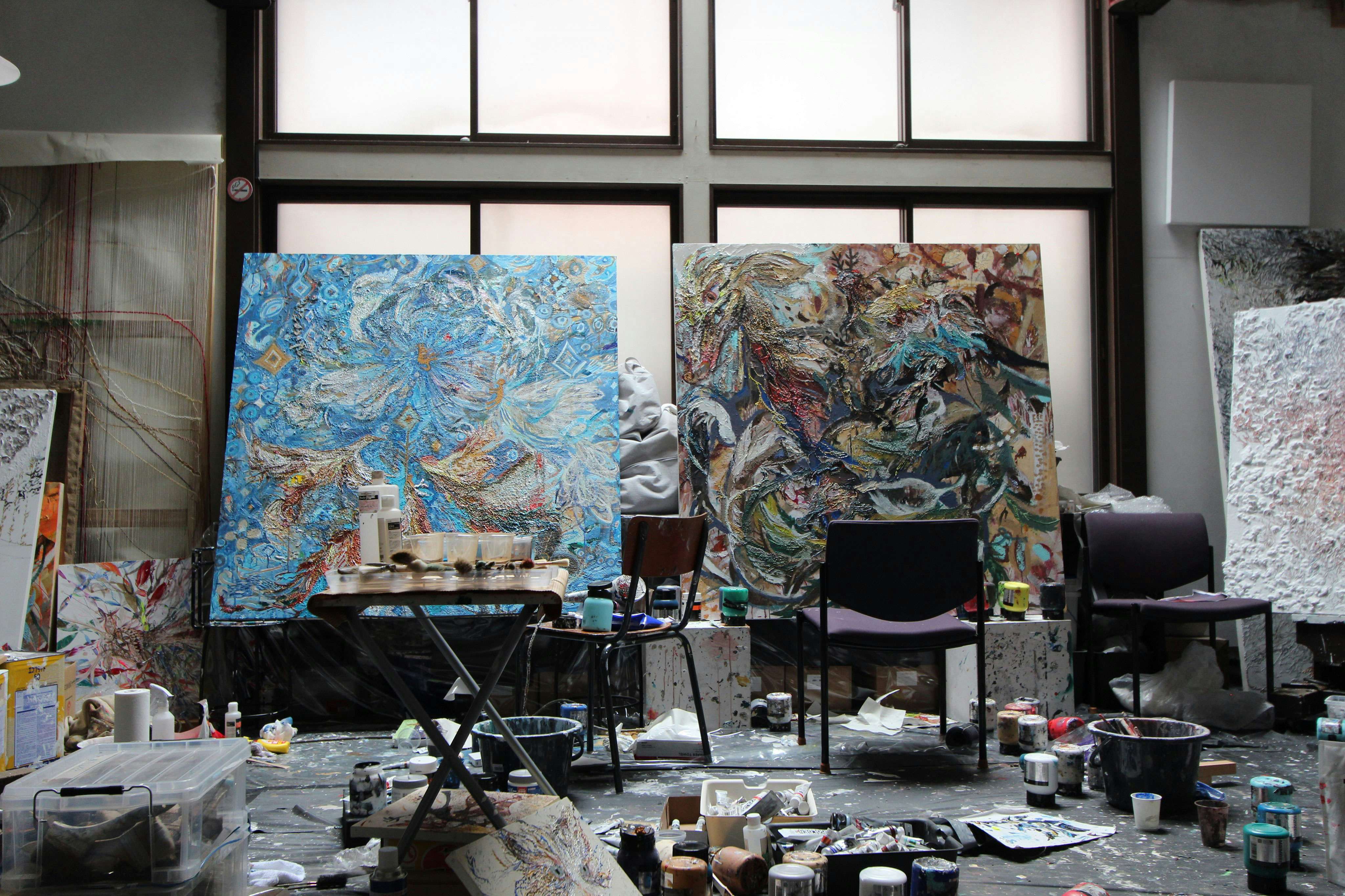 2人のアーティストが互いに、作品に置かれた色や素材、痕跡から想像力によって反応し、描く肉体的行為と内的イメージを同時に織り成し、飛躍していく様を楽しむかのような有機的な表現は、私たちが本来自然を介して持つ原始的・根源的な想像力に働きかけ、焦点を当てる契機をもたらすだろう。