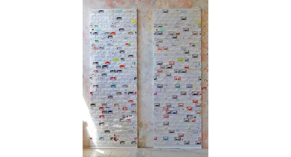 本展では、世界各地のギャラリスト、キュレーター、アーティストの名刺を素材に、スグラフィットと呼ばるれるルネッサンス時代に編み出されたグラフィックの技法を参照した彫刻作品「monos」を中心に展示。幾何学模様にカットされた名刺は、彫刻の対象物として作為的に彫られた部分とその行為によって無作為に生じた非対象物の2つに切り分けられているが、相似の型をなし、本質的には同価値であることを示唆する。また同作品は、彫刻という創造行為はある種の破壊行為と表裏一体の関係で成り立っているということも鑑賞者に暗示する。