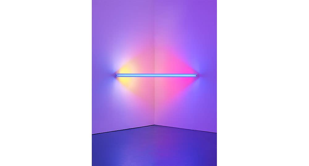本展の出発点となる作品は、市販されている蛍光灯を用いて私たちと環境との関係性への再考を促す、ダン・フレイヴィンの作品「untitled(to Virginia Dwan)2」。この作品は従来の色の光の線が交差、あるいは平行することで構成され、街のネオンをイメージしたマルチカラーの光が空間が景観を一変させる。