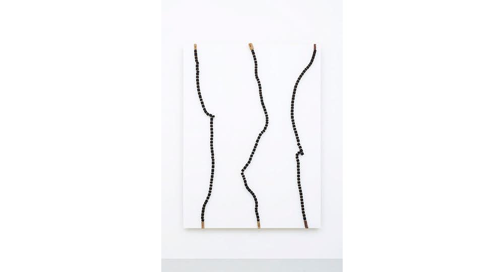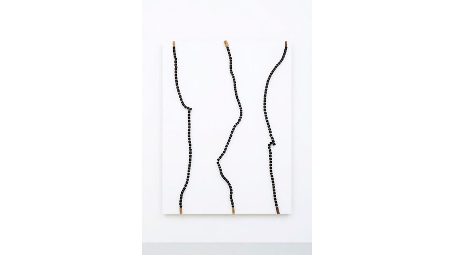 立体作品《景素》《場空》では、端に置かれた数個の枝の断片と断片、そのあいだを小さな石や木片が自由に軌跡を表しながら連なり並ぶ。その連続性は、ものが意思を持って動いた結果であるかのように、それぞれ異なる様相を表し、無限のリズムやエネルギーが作品の枠を超えていくさまを思わせる。