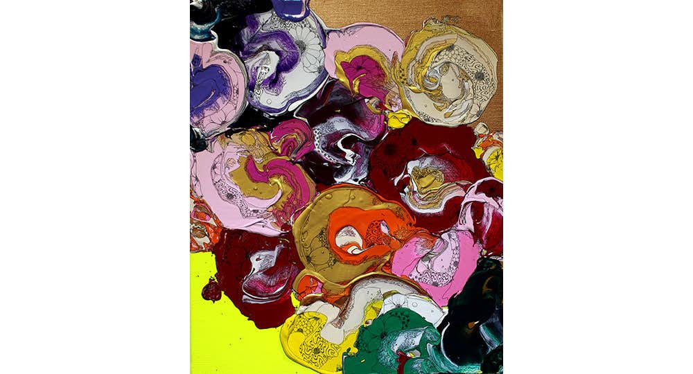 「花を描いてはいるが特定の花というわけではなく、花に見えなくてもいい」と作家が述べるように、たんに具象としての花を描いているわけではなく、いくつもの記憶のなかの視点のそれぞれを、平面という空間に交錯させている。描き出されたモチーフは、作家が「自己をサルベージ(救出・救助)する」なかでたどり着いた、幼少期の記憶がもととなっていると言い、またコロナ禍をきっかけに生み出されたものでもある。